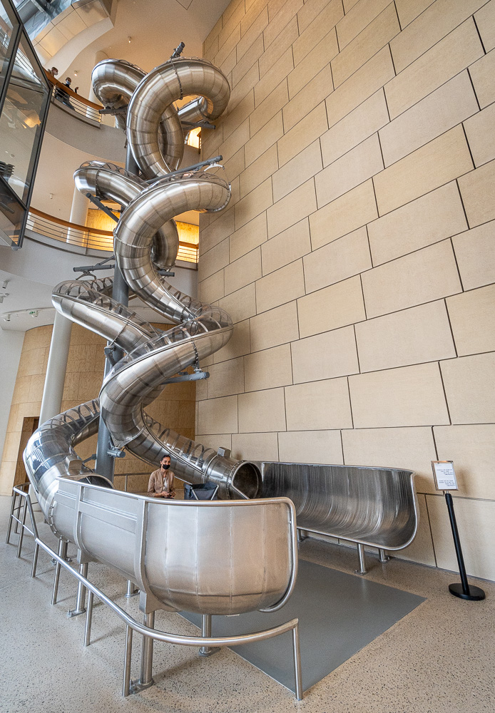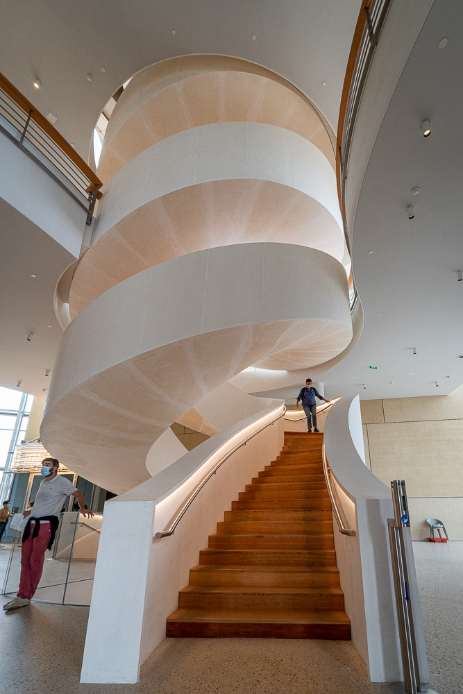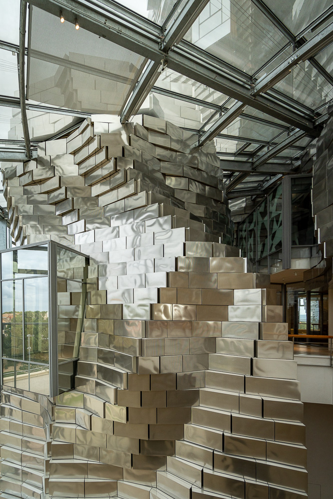 Ich frühstücke zuhause und gönne mir dann einen Kaffee draußen beim Le Calendal. Die Fönwärme drückt. Doch der dramatische, graue, mit vielen Wolken gespickte Himmel besänftigt mich. Beschwingt laufe ich weiter zum Luma. Von außen konntet ihr diesen Heiligen Gral der Modernen Kunst im gestrigen Beitrag schon bewundern. Heute versuche ich euch ein paar seiner inneren Werte zu vermitteln.