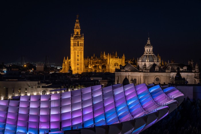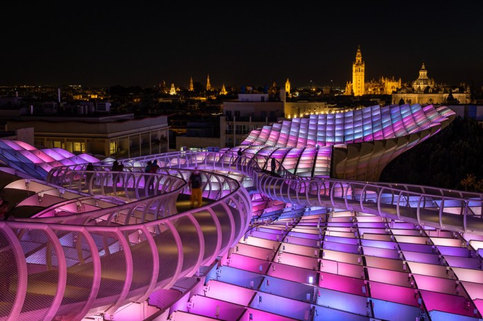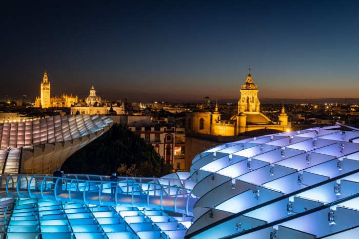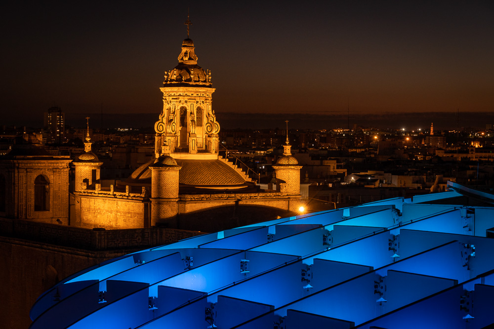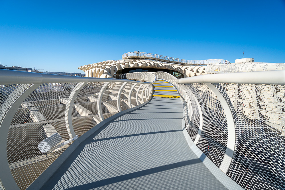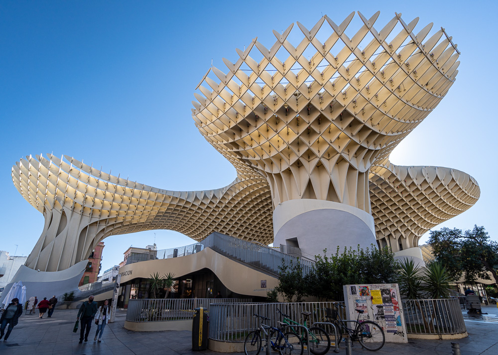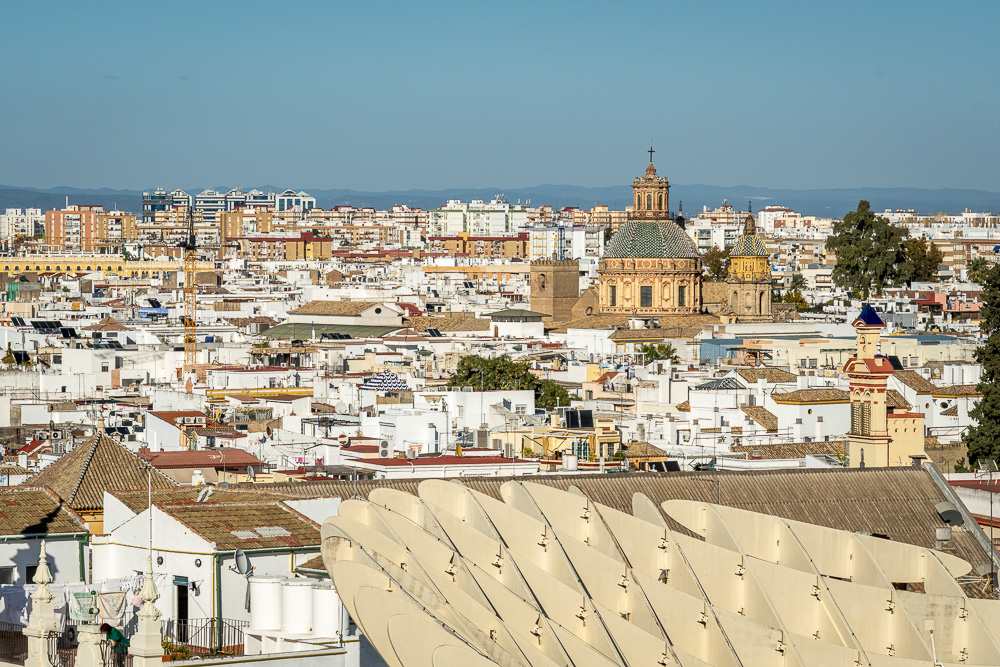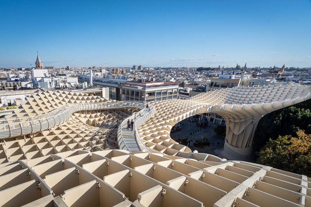 Der Rest des Tages steht ganz im Zeichen der Pilze, die seit rund zehn Jahren hier mitten in der Stadt aus dem Boden sprießen. Las Setas de Sevilla (zu deutsch eben ‚Die Pilze von Sevilla‘) hören offiziell auf den Namen ‚Metropol Parasol‘. Aber wie man es namentlich auch dreht und wendet: das mit allerlei Inhalten gefüllte Monument und die gleichzeitig höchste Holzkonstruktion der Welt ist sensationell! Sie füllt etliche sehr unterschiedliche Rolle aus. So ist sie Schattenspender, Markthalle und Heimat für ein Museum. Das in meinen Augen Beste ist neben der gelungenen Optik die in 25 Metern Höhe gelegene Aussichtsplattform, die mittels eines Rundwegs einen 360-Grad-Panoramablick über Sevilla bietet.
