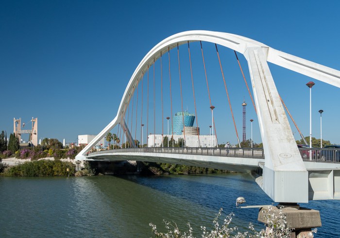 Vom Ufer des Guadalquivir aus hat man an dieser Stelle nicht nur eine gute Sicht auf das ehemalige Gelände der Weltausstellung, sondern auch auf die Puente de Alamillo. Dieses Werk von Santiago Calatrava entstand ebenfalls im Zusammenhang mit der Expo.