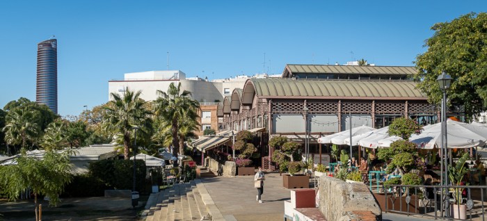 Upps, nun hat es mich doch ganz schön weit aus der Innenstadt hinaus getrieben. Ich drehe um und laufe weitgehend am Flußufer entlang bis zum Mercado Lonja del Barranco, direkt an der Puente Triana gelegen. Und hier kommt wieder John ins Spiel. Denn er hat mir den Besuch dieser Markthalle ans Herz gelegt, wenn mir einmal nach einem leckeren Lunch sein sollte.