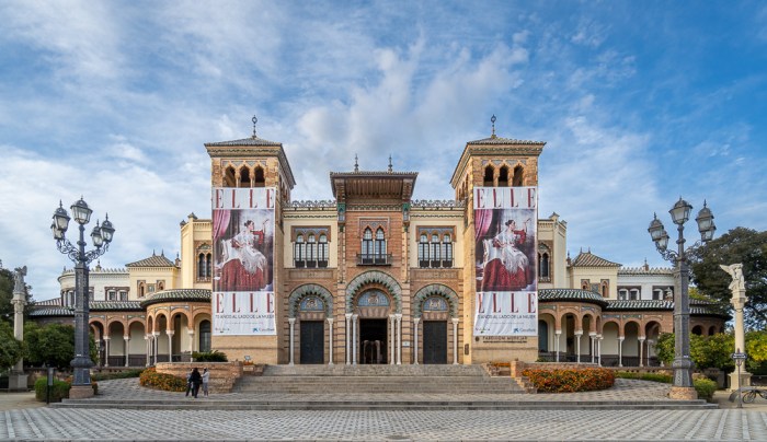 Am zur Innenstadt gelegenen Ufer laufe ich bis zum Torre del‘Oro, den aufmerksame Leserinnen und Leser bereits in den vorangegangenen Berichten über Sevilla zu Gesicht bekamen. Dort erstehe ich gegen Mittag ein Tagesticket für den Hop-On Hop-Off Bus und lasse mich gemütlich durch die doch recht weitläufige Stadt gondeln. Interessiert lausche ich den über Kopfhörer zugeführten Infos, bis ich am Stop 8 den Bus verlasse. Dort wartet nach ein paar Hundert Metern ein kulturelles Highlight der Stadt auf mich, das ich mir auf keinen Fall durch die Lappen gehen lassen möchte.