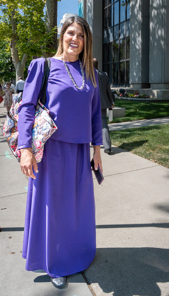 Auf dem Rückweg kommt mir ein Mitglied des berühmten Tabernacle Choir entgegen, dem ich eben noch fasziniert gelauscht hatte. Die sympathische Dame ist unschwer an ihrer Kleidung zu erkennen. Diese Gelegenheit lasse ich mir natürlich nicht durch die Lappen gehen! Ich spreche sie an und gebe ihr ein positives Feedback zu ihrem Auftritt.