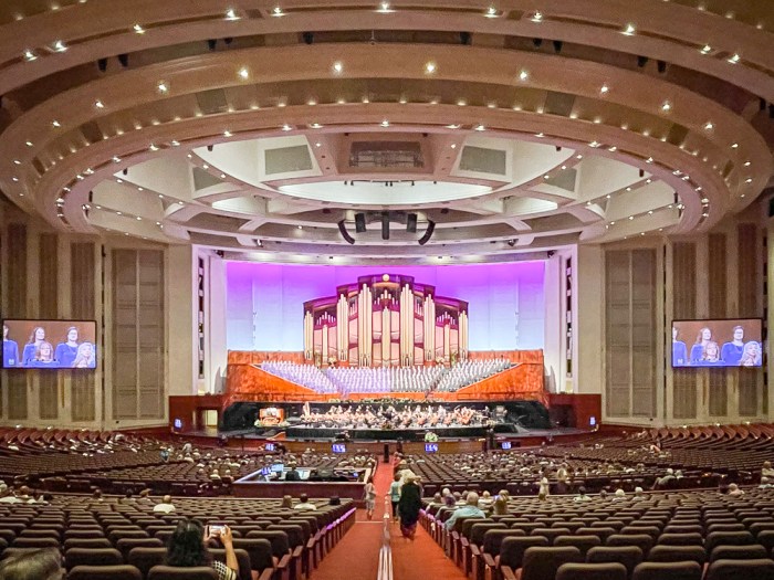 Als ich den großen Saal mit seinen sagenhaften 21.000 Sitzplätzen betrete, bin ich zum einen beeindruckt von dessen Architektur, der Weite des Raumes und der wechselnden Beleuchtung hinter der gewaltigen Orgel. Und zum anderen wundere ich mich spätestens jetzt auch nicht mehr darüber, dass man wirklich ohne Voranmeldung hier einfach aufkreuzen und dem berühmten Chor lauschen kann.