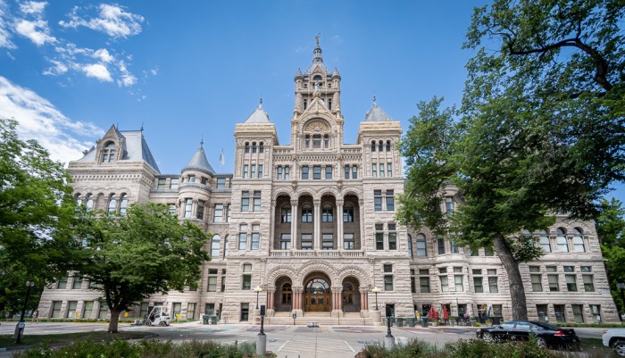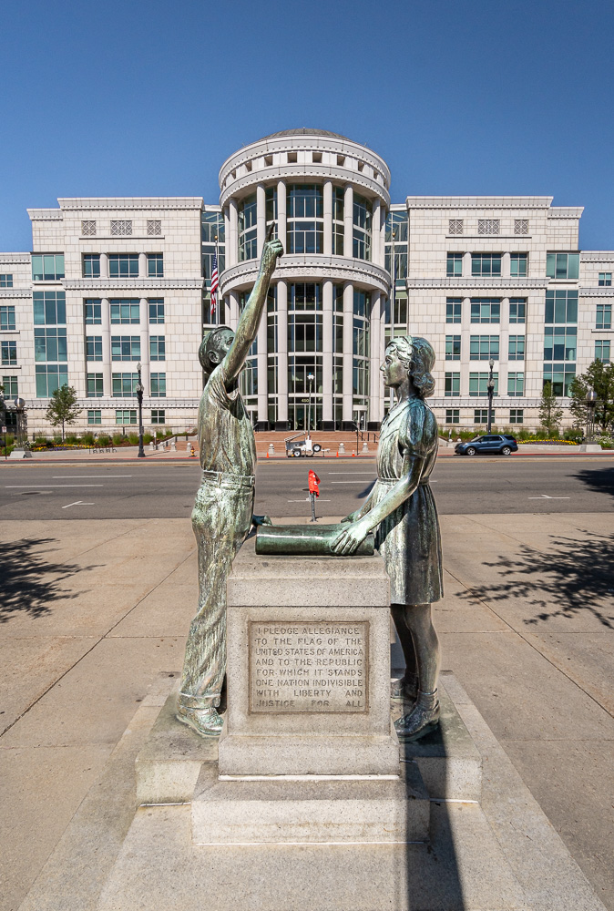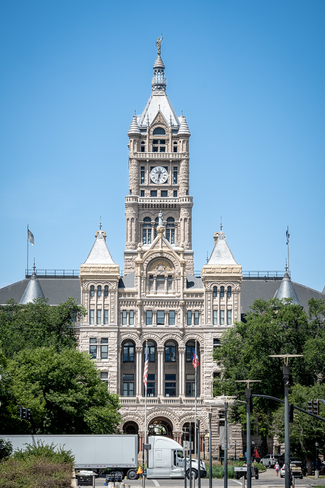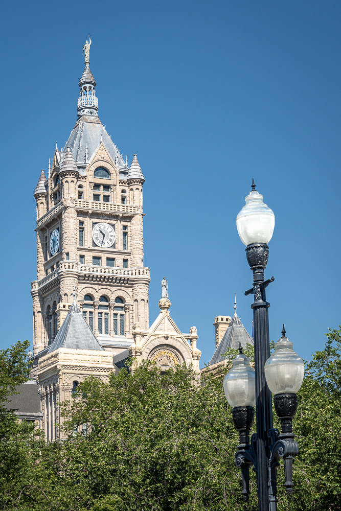 Als ich am späten Vormittag wieder unten auf der Straße stehe, fallen doch tatsächlich ein paar ersehnte Regentropfen! Doch sie verdampfen in der Hitze, bevor sie den Boden berühren können. Anschließend bringt mich die Straßenbahn in die Ecke der Stadt, die ich gestern wegen der anhaltenden Abbauarbeiten des Utah Art Festivals nicht ungestört fotografieren konnte. Doch heute kann ich das nachholen. Darf ich vorstellen? Da wäre zum einen das Salt Lake City and County Building im Washington Square Park, …