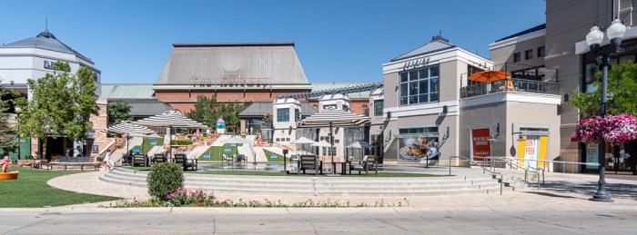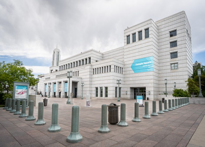 Direkt gegenüber auf der anderen Straßenseite beginnt der Temple District. Dem Conference Center der LDS-Kirche, …