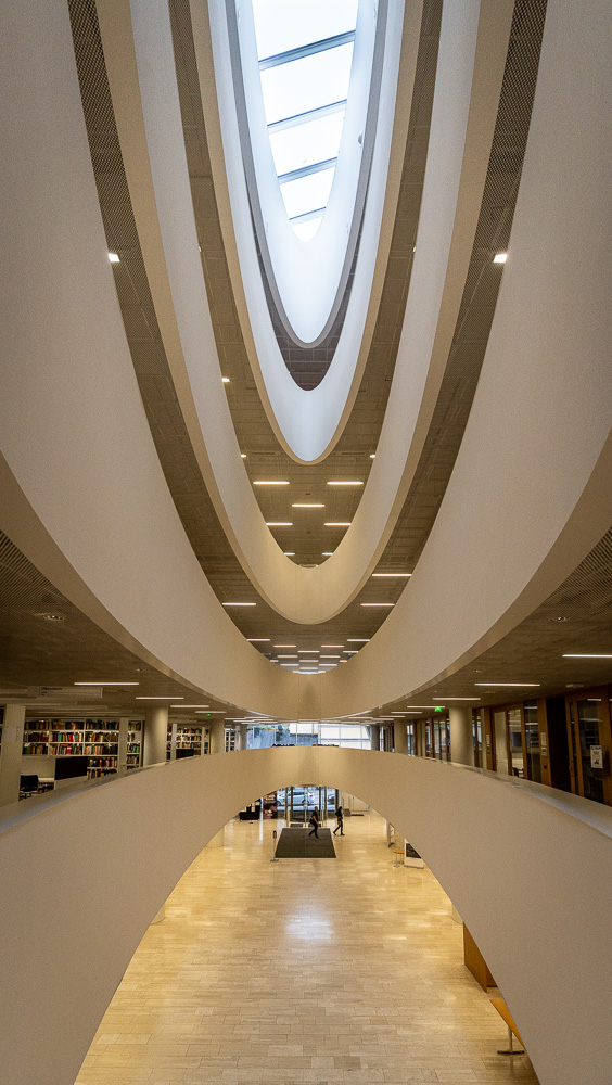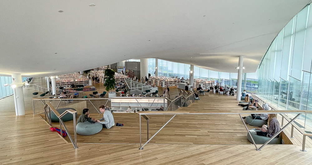 Dieses Gebäude fasziniert uns so sehr, dass wir uns auch in seinem Inneren ausführlich umsehen. Die Bibliothek ist nicht nur sehr sehenswert, sondern auch recht ungewöhnlich. So kann man hier nicht nur lesen, Lesestoff ausleihen, gemütlich herumsitzen und nebenbei einen Kaffee trinken.
