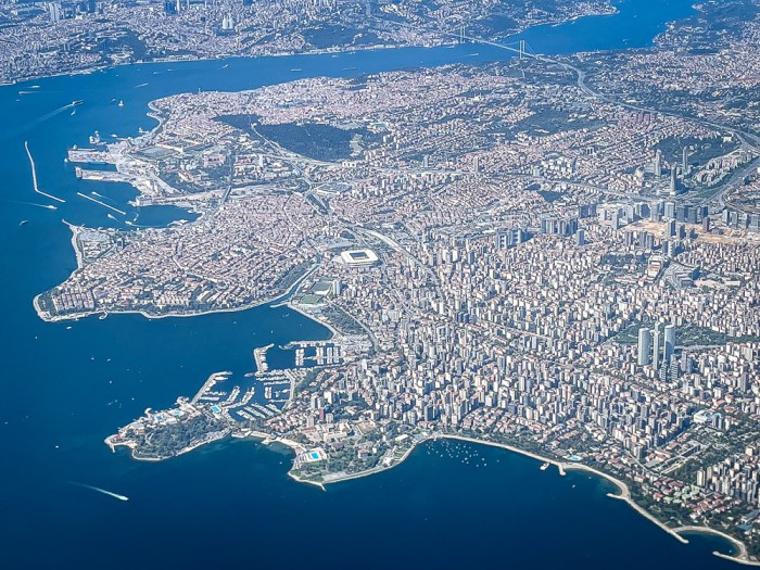 Nach zweieinhalb angenehmen Flugstunden setzen wir pünktlich zur Landung an und werden mit einem ersten wunderbaren Überblick über die berühmte Stadt am Bosporus belohnt.