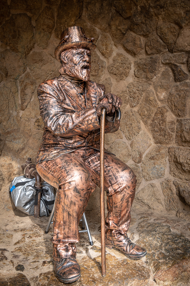Innerhalb des Parkgeländes treffen wir dann noch unverhofft auf den Meister persönlich. Mein schlichtes Gemüt geht wie selbstverständlich davon aus, dass es sich hierbei um eine metallene Statue von Gaudí handelt. Und so komme ich der glanzvollen Gestalt auf der Suche nach der besten Fotoperspektive geradezu unanständig nahe. Doch Stefans scharfem Blick entgeht nichts! Und so warnt er mich rechtzeitig, dass ich es hier mit einem sehr lebendigen Pantomimen zu tun habe 😂.