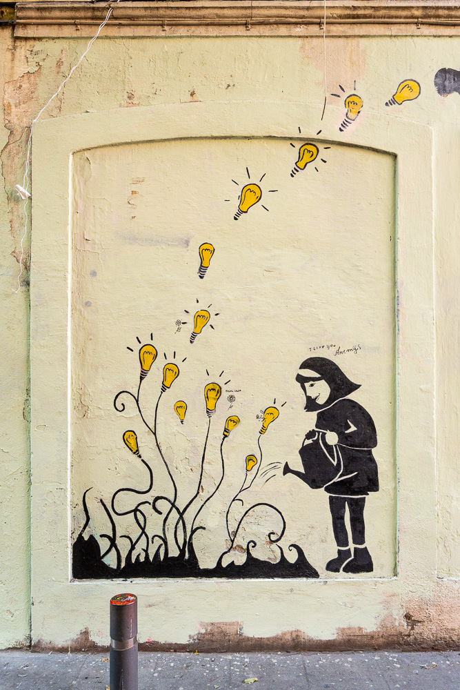 Nach insgesamt drei Stunden im Park lassen wir uns wieder den Berg hinunter kullern. Kurze Zeit später landen wir im In-Viertel Gràcia, einer einst eigenständigen Stadt, bevor sie von Barcelona einverleibt wurde. Doch das hat dem ganz eigenen Charme des – so der O-Ton meines Dumont-Reiseführers – ‚Dorfes in der Stadt’ keinen Abbruch getan. In den kleinen Gassen mit den zahlreichen Restaurants, Cafés und kleinen Lädchen lässt es sich gemütlich flanieren.