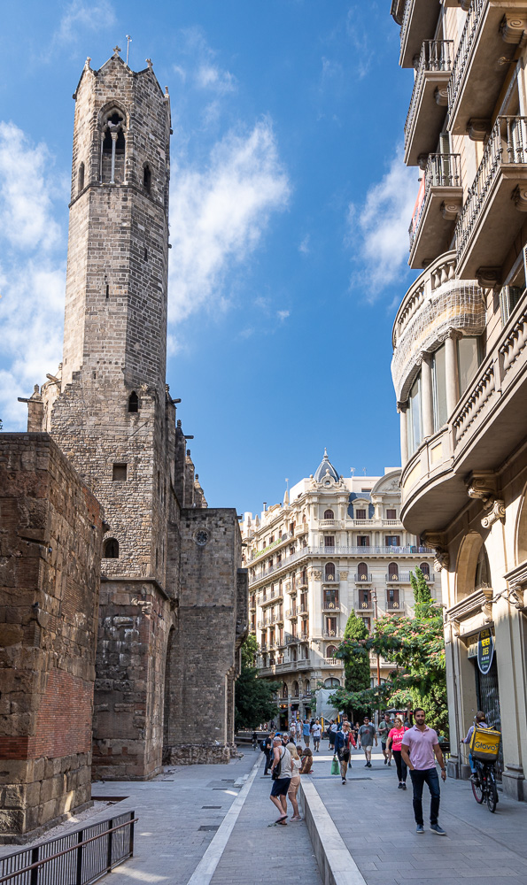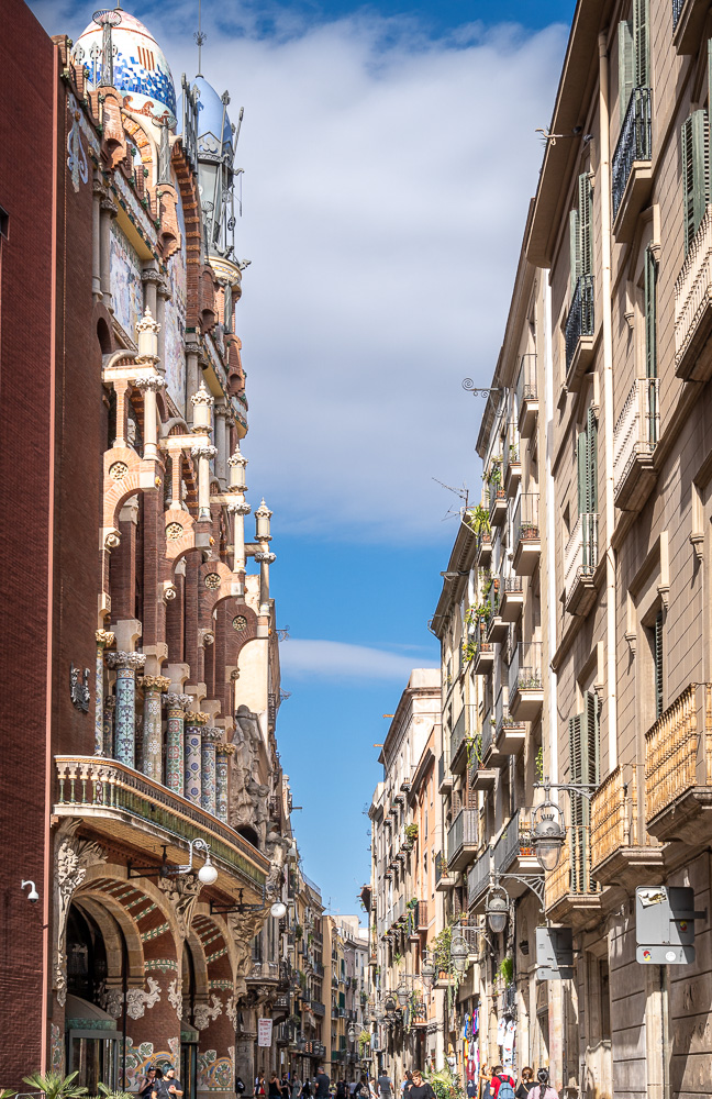 Wir schauen zwischendurch noch kurz beim Merkat de Santa Caterina vorbei. Doch für das tägliche Marktgeschehen sind wir deutlich zu spät dran. Die Markthalle ist bereits geschlossen. Unser nächster kleiner Abstecher führt uns zum sehr ansehnlichen, aber wegen seiner Lage in einer schmalen Straße schwer zu fotografierenden Palau de la Musica. Hier sehen wir katalanischen Jugendstil vom Feinsten! Und die unmittelbare Umgebung verführt uns ebenfalls dazu, die Kamera aus der Reserve zu locken.