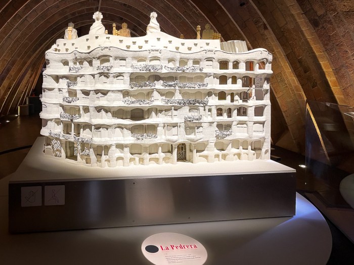 An diesem relativ frühen Morgen sind gar nicht so viele Leute gleichzeitig mit uns zu Gast in der Casa Milà. Wir beginnen unseren Rundgang in der für Besucher zugänglichen Musterwohnung dieses ungewöhnlichen Wohnhauses. So sehr wir uns auch bemühen: wir können keine einzige gerade Wand entdecken! Das Verspielte der Architektur findet sich auch im Inneren wieder, inklusive Treppenhaus.