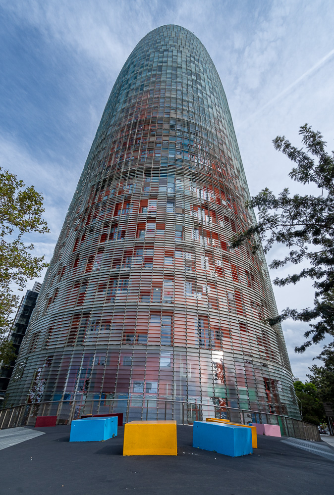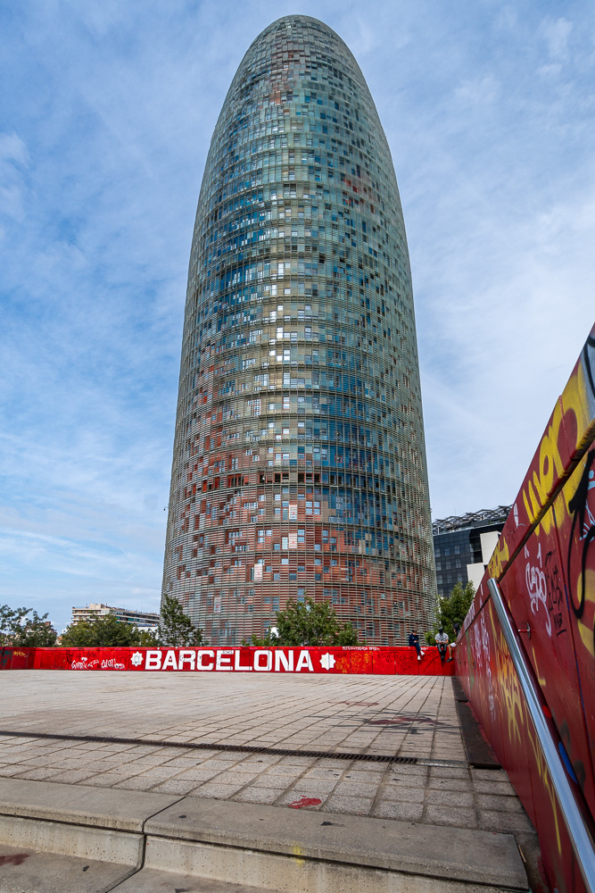 Zeit für ein Kontrastprogramm. Der Torre Glòries, früher bekannt als Torre Agbar, ist uns schon gleich am Anfang unseres Aufenthalts hier in Barcelona buchstäblich ins Auge gesprungen. Unschwer ist er schon von weitem von vielen Stellen aus im Stadtbild auszumachen.