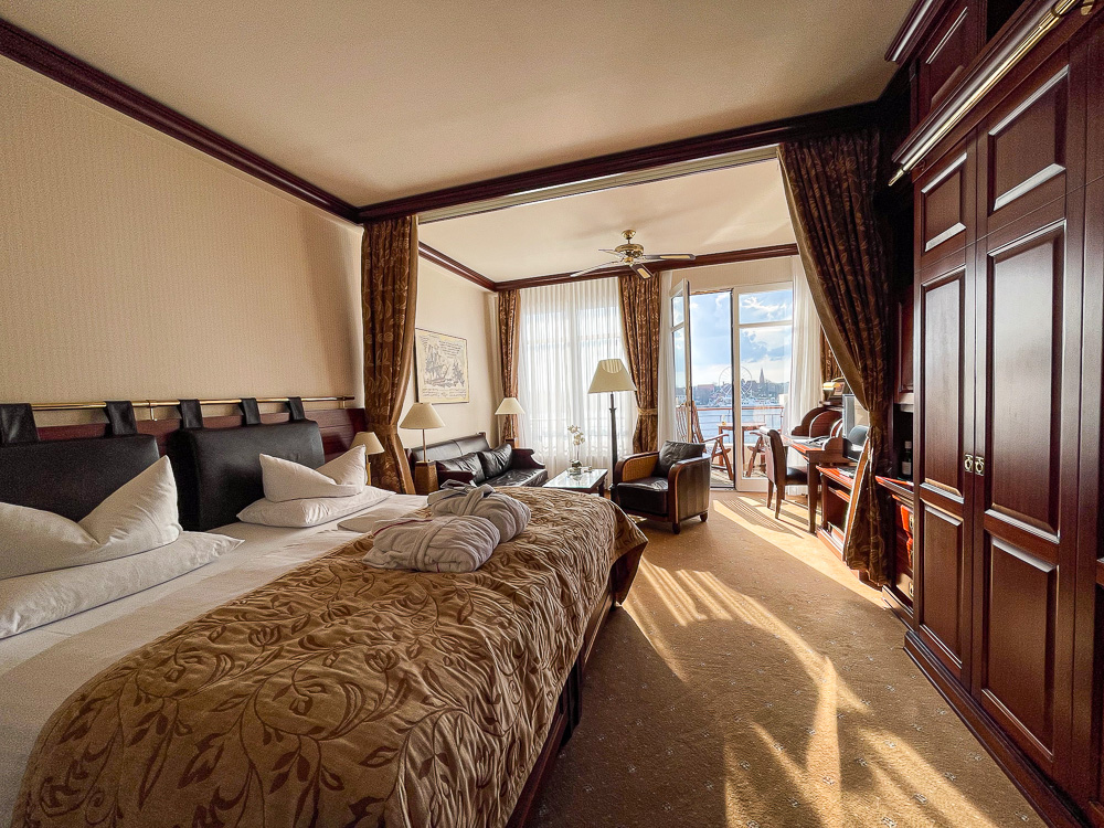 Ich bekomme das Zimmer 3320 im obersten Stockwerk im Nebengebäude mit Blick auf die Warnow und Warnemünde. Warum erwähne ich dieses Detail? Nun, es soll sowohl eine Empfehlung für euch als auch ein Memo an mich selbst sein. Doch es geht noch besser. Die Nummer 3322 direkt nebenan ist ein Eckzimmer mit riesigem Balkon, der ebenfalls ums Eck angeordnet ist. Allerdings wäre ein Zimmer im Hauptgebäude mit Blick auf den Yachthafen sicher auch nicht zu verachten. Da sind sie, die wahren Luxusprobleme 😅.