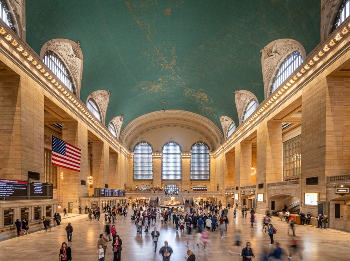 … machen wir New Yorks riesigem Prachtbahnhof, dem altehrwürdigen Grand Central Terminal, unsere Aufwartung. Das über 100 Jahre alte Beaux-Arts-Gebäude ist vor allem im Inneren eine Augenweide. So schauen wir uns auch auf den verschiedenen Ebenen etwas genauer um. Und natürlich lassen wir es uns nicht nehmen, das berühmte Flüstergewölbe auszuprobieren. Direkt vor der berühmten Oyster Bar können weder neun Meter Distanz noch der meist hohe Lärmpegel nicht verhindern, dass zwei sich diagonal in den Ecken gegenüberstehende Personen flüsternd verständigen können.