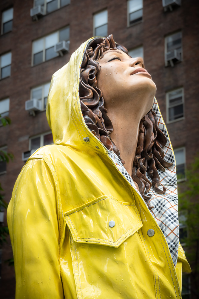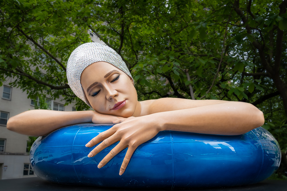 Dass wir ausgerechnet diese Richtung auf dieser Straße eingeschlagen haben, verdanken wir dem Pfützen-Fotografen, der uns ans Herz legt, doch unbedingt die Skulpturenausstellung der Bildhauerin Carole Feuerman auf dem Mittelstreifen weiter südlich anzusehen. Das lassen wir uns natürlich nicht entgehen! Auch wenn die eine oder der andere unter euch nicht unbedingt an Kunst interessiert ist: riskiert trotzdem einen kurzen Blick auf die lebensgroßen und täuschend echt aussehenden Badenixen. Wir finden sie genial!
