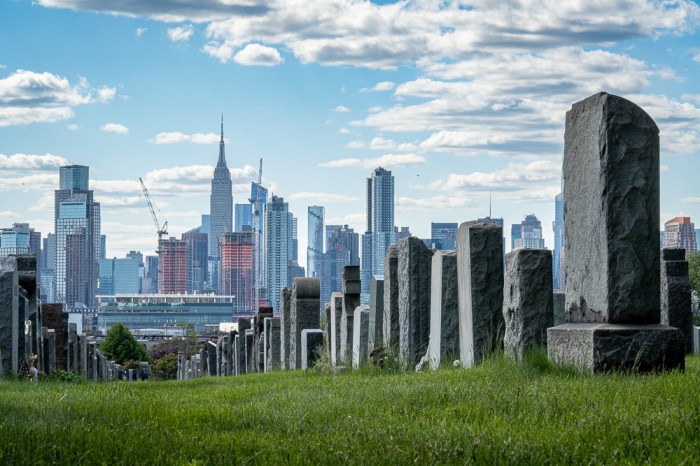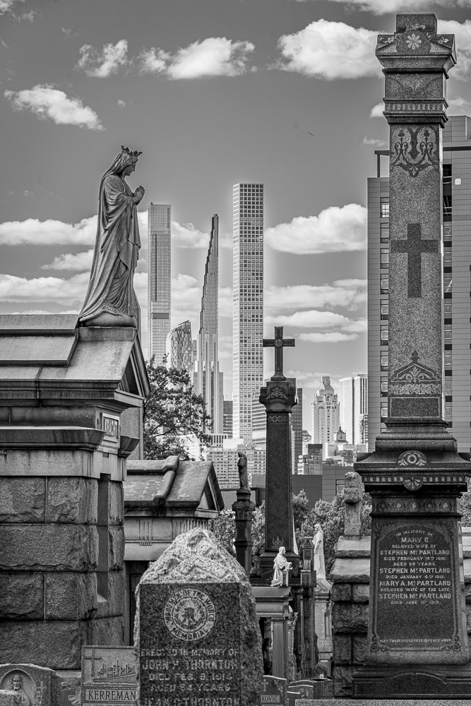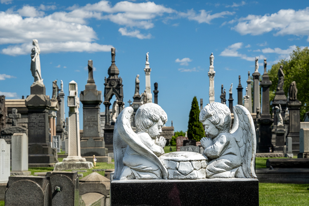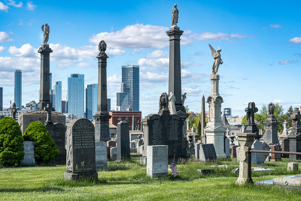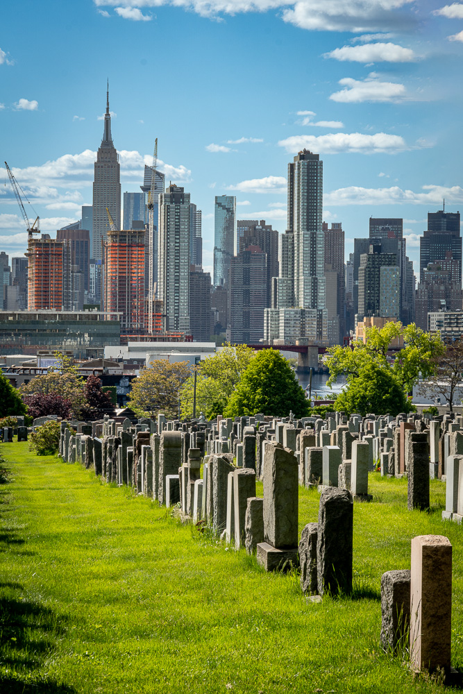 Denn der berühmte, in eine weitläufige Parklandschaft eingebettete Friedhof verspricht dank seiner Hanglage spannende Aussichten und Fotomotive. Die aufwendig gestalteten Grabmäler im Vorder- und die ferne Skyline Manhattans im Hintergrund sorgen dabei für interessante Verschiebungen der Perspektive. Ein gefundenes Fressen für uns! Dass wir das Areal an diesem Nachmittag fast ganz für uns alleine haben, kommt als Sahnehäubchen noch obendrauf.