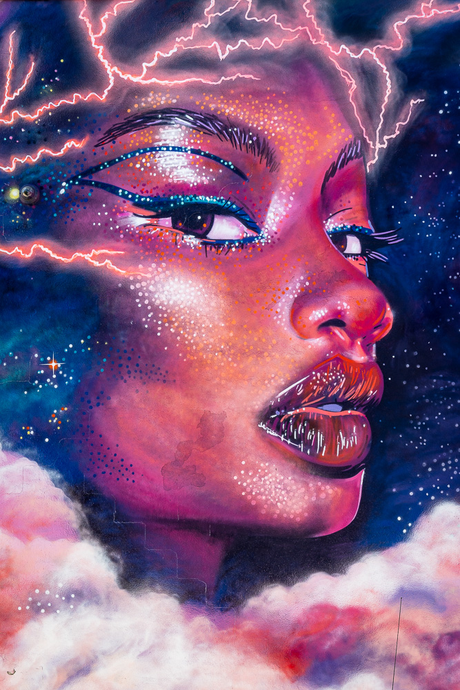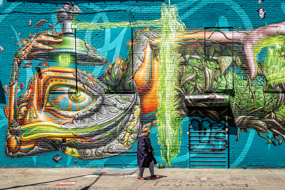 Als wir am U-Bahnhof Jefferson aussteigen und unseren Rundgang beginnen, reiben wir uns schon nach kurzer Zeit ungläubig die Augen. Richtig tolle Murals reihen sich aneinander wie die vielzitierten Perlen auf einer Schnur. Garniert wird die kunterbunte Szenerie durch die sehr angenehme, unaufgeregte Atmosphäre im Kiez, viele kleine Cafés und Restaurants und ein überwiegend junges, sympathisches Publikum. Die kleinen, bunten Häuschen, die die Querstraßen zieren, sind schön, aber nicht auf Hochglanz poliert.
