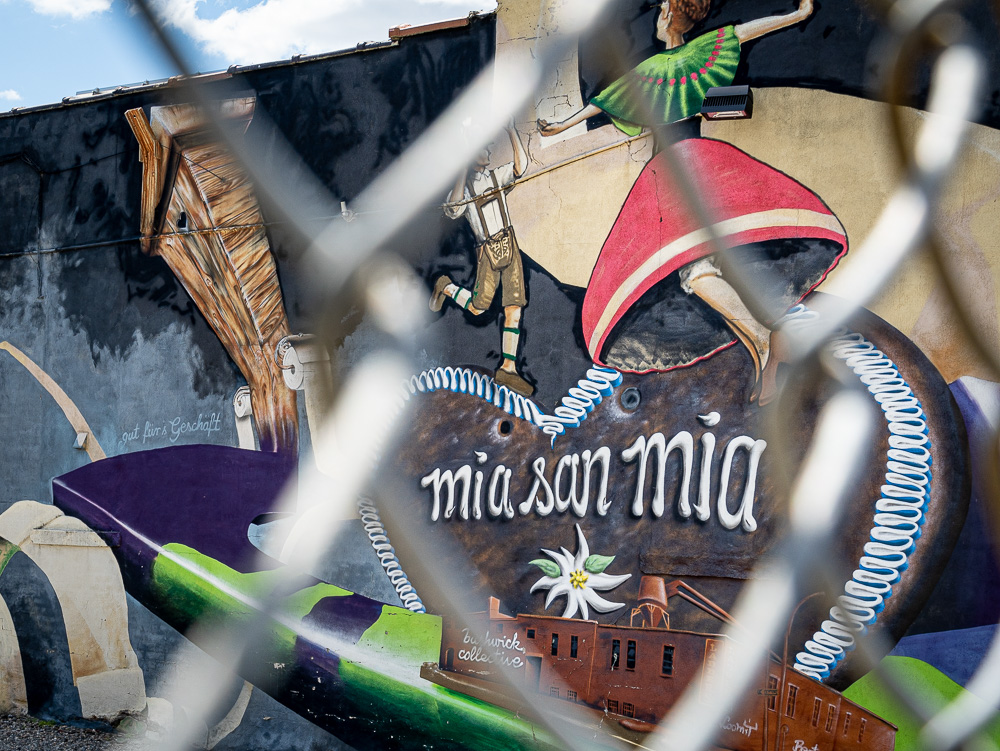 Aber auch die Street Art ist klasse. Da kann man sich gar nicht entscheiden, welches am besten gefällt. „Mia san mia“ und „Luftnummer“ sind ganz lustig, haha. Aber „Im Farbrausch“ mit dem passenden Hydrant ist auch cool.
