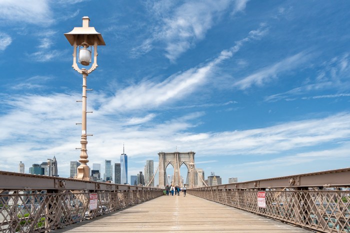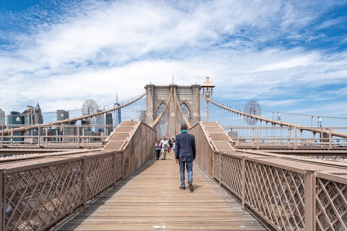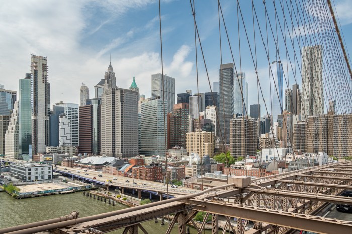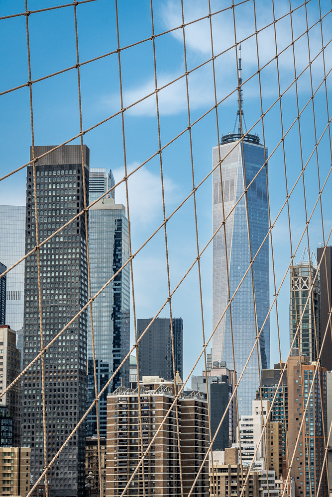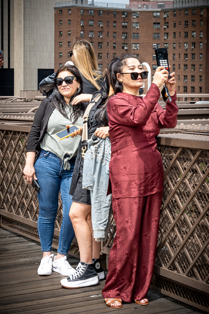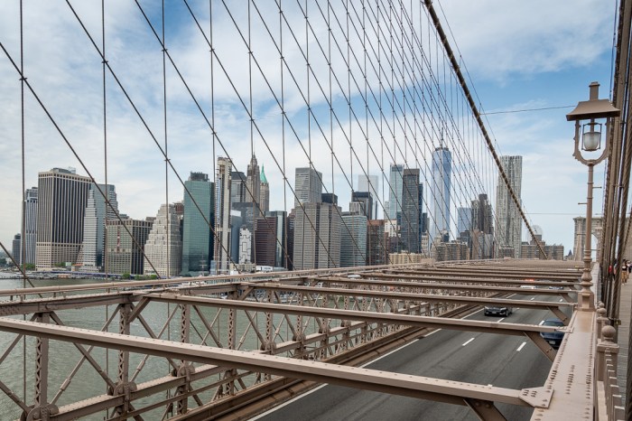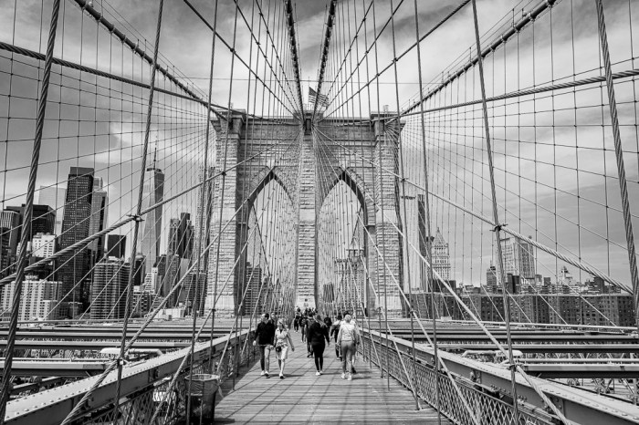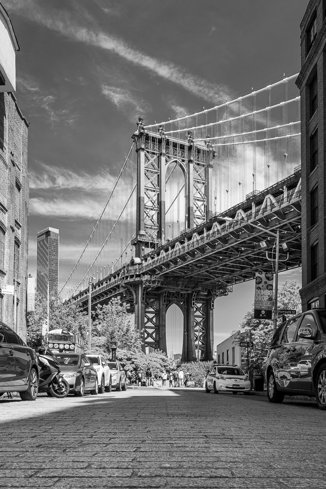 Bevor die Hauptdarstellerin die Bühne betritt, füttere ich euch noch mit ein paar Basisinfos. Die 1883 fertiggestellte kombinierte Hänge- und Schrägseilbrücke ist eine der ältesten dieser Bauart in den USA. Sie überspannt den East River und verbindet so die Stadtteile Manhattan und Brooklyn miteinander. Von den insgesamt fünf für den Fahrzeugverkehr zur Verfügung stehenden Fahrstreifen führen drei von Manhattan nach Brooklyn und zwei in die Gegenrichtung. Deren dritte Fahrspur wurde zur Fahrradspur umgewidmet. In der Etage darüber dürfen wir Fußgänger über einen großzügigen breiten Weg flanieren.