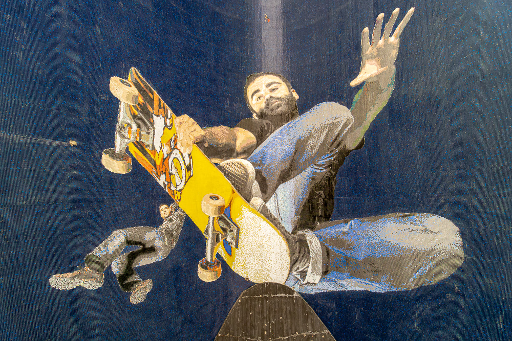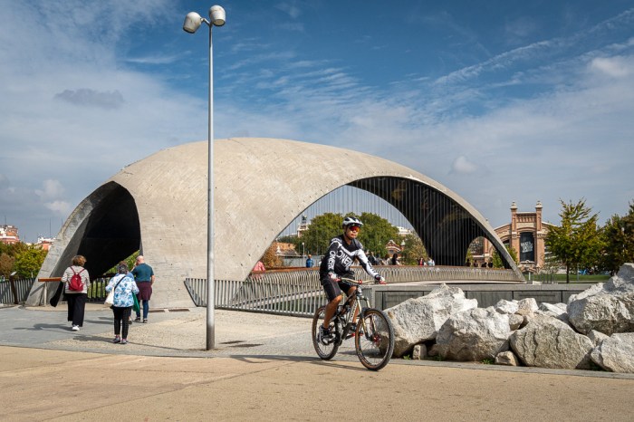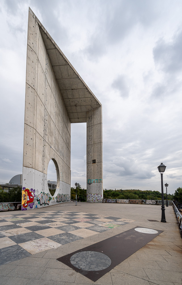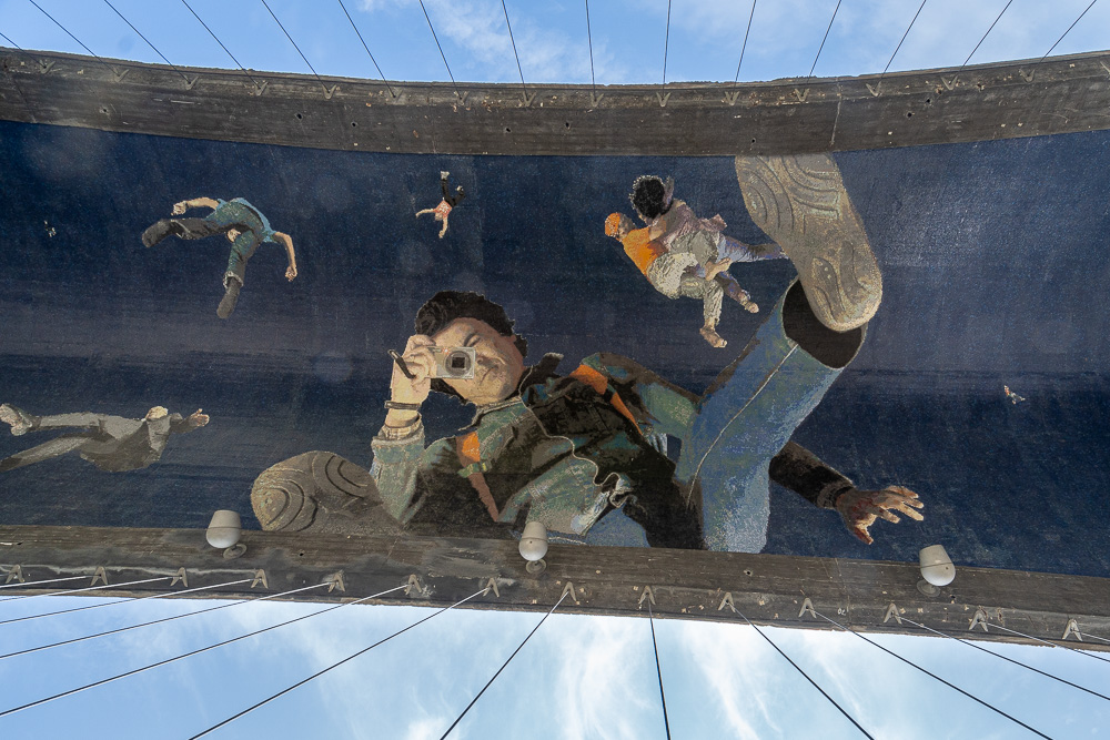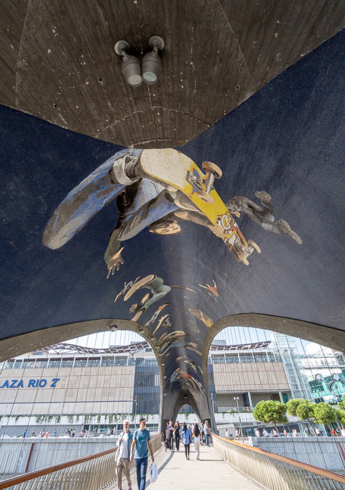 Die andere Flussseite erreichen wir über die kuppelförmige Puente Cáscara Matadero. Hier lohnt sich auch ein Blick nach oben. Denn an der Decke geht es sportlich zu! Modell standen hier übrigens echte Akteure, die hier im Arganzuela Park ihrem Bewegungsdrang nachgeben.