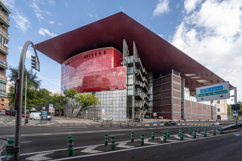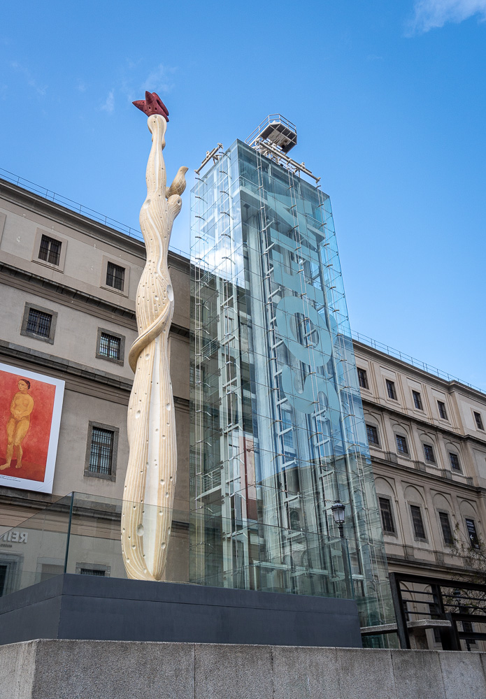 Direkt gegenüber des Bahnhofs liegt Madrids Heiliger Gral der modernen Kunst, das Museum Reina Sofía. Selbstverständlich werde ich es noch besuchen. Doch heute begnügen wir uns mit den ansehnlichen Äußerlichkeiten. Wie sich herausstellt, haben wir mit dem heutigen Dienstag einen Glücksgriff getan. Denn das Museum ist an diesem Wochentag geschlossen, und folglich laufen uns nur wenige Leute ungewollt vor die Linse. Auch der Himmel gibt alles, um unsere Fotos gelingen zu lassen.