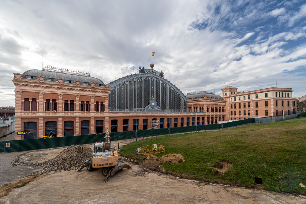 Wir wollen vielmehr zum Atocha Bahnhof, weil er so schön ist. Zwar dominieren zum Zeitpunkt unserer Reise diverse Baustellen in und um ihn herum die Szenerie. Doch wahre Schönheit kann nichts entstellen. Das Hauptgebäude des Bahnhofs ist von außen und von innen eine Augenweide. Und zum Glück ermöglichen es uns Stefans stattliche 195 Zentimeter Körperlänge, mit den Kameras über den lästigen Bauzaun zu linsen. Die seitliche Ansicht indes ist auch mir, der Kleinen mit ihren vergleichsweise mickrigen 175 Zentimetern, ohne Sichtbehinderung möglich.