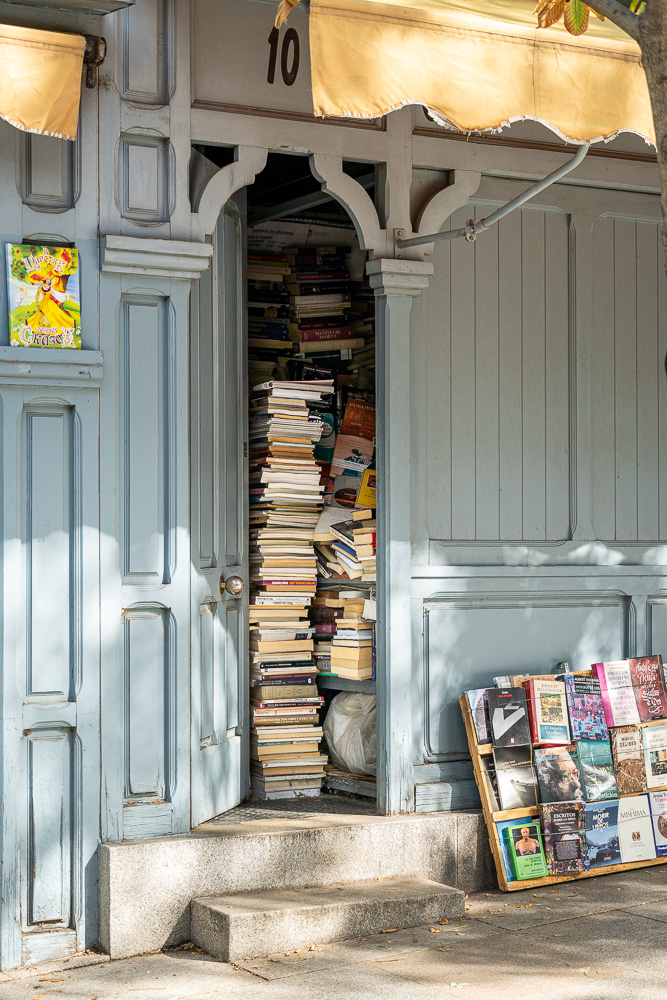 Auch zu unserem nächsten Ziel, dem Retiro Park, ist es nicht weit. Der grünen Lunge der Stadt hatten wir bereits zu Beginn der Reise einen Besuch abgestattet, jedoch nicht alles geschafft, was wir sehen wollten. Das wollen wir heute nachholen. Auf dem Weg zum Park schlendern wir die Fußgängern und neuerdings auch Radfahrern vorbehaltene Promenade Cuesta de Moyano entlang. Dort lädt ein dauerhafter Büchermarkt zum Innehalten, Schmökern und Beobachten ein. Ach, wäre mein Spanisch nur etwas besser! Ich würde hier glatt länger verweilen.