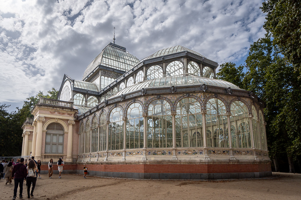 Im Retiro Park angekommen, schlagen wir den direkten Weg zu den beiden architektonischen Schätzchen ein, die uns noch in der Sammlung fehlen. Wir beginnen mit dem Kristall-Palast. Dieses Musterbeispiel der Eisenarchitektur scheint vor Leichtigkeit förmlich zu schweben! Ursprünglich als riesiges Gewächshaus geplant, dient es heute als eine der Außenstellen des Reina Sofía Museums. Zur Zeit ist der Palast jedoch geschlossen.