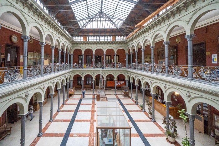 Unser nächstes Ziel liegt weit im Norden der Stadt, zu weit, um es zu Fuß zu erreichen. Die U-Bahn bringt uns zu einem Gebäude namens Minas y Energias, das heute zur Universität gehört. Dort lässt man uns ungehindert passieren. Und so kommen wir in den Genuss dieses tollen Anblicks.