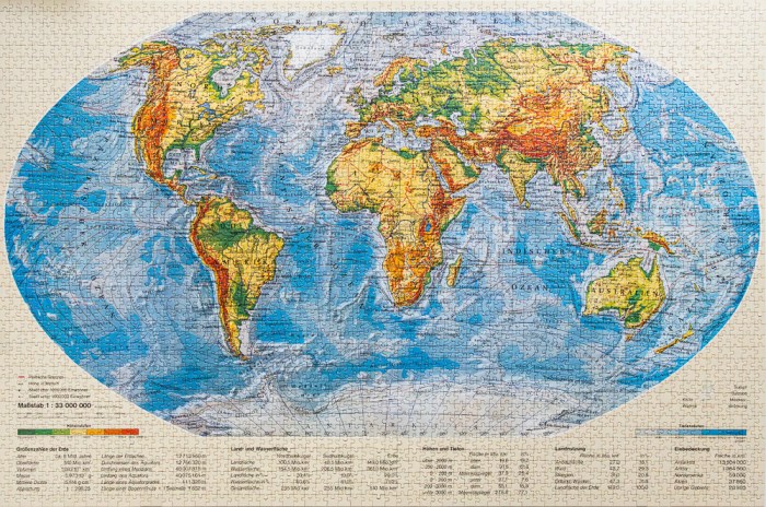 Die Topografie der Welt, komprimiert auf 120×98 Zentimeter, zerstückelt in 3.000 Teile, galt es, zusammenzufügen. Das war gar nicht so einfach – besteht doch die Erde zu 71% aus Wasser und nur zu 29% aus deutlich leichter zu identifizierender Landmasse. So haben mich die farblich subtil ineinander übergehenden unterschiedlichen Meerestiefen doch deutlich mehr herausgefordert als die diversen Höhenlagen der Kontinente.