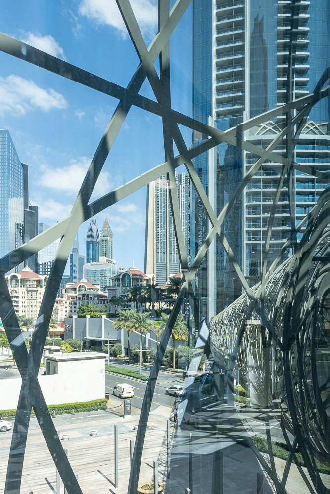 Dubai ist eine Stadt für Autofahrer. Die 12-spurige Zayed Road, Hauptverkehrsachse der Stadt und gleichzeitig Schnellstraße nach Abu Dhabi, wird noch ergänzt durch weitere, parallel verlaufende Nebenfahrbahnen. Fußgänger müssen in der Regel sehr weite Wege laufen, um auf die andere Straßenseite zu gelangen. Am einfachsten ist es, die über Brücken geführten Zugänge zu den U-Bahnhöfen zu nutzen. Da die Station Dubai Mall nur wenige Hundert Meter von unserem Hotel entfernt liegt, sind wir diesbezüglich in einer guten Pole Position.