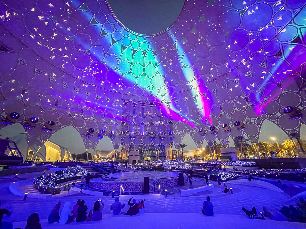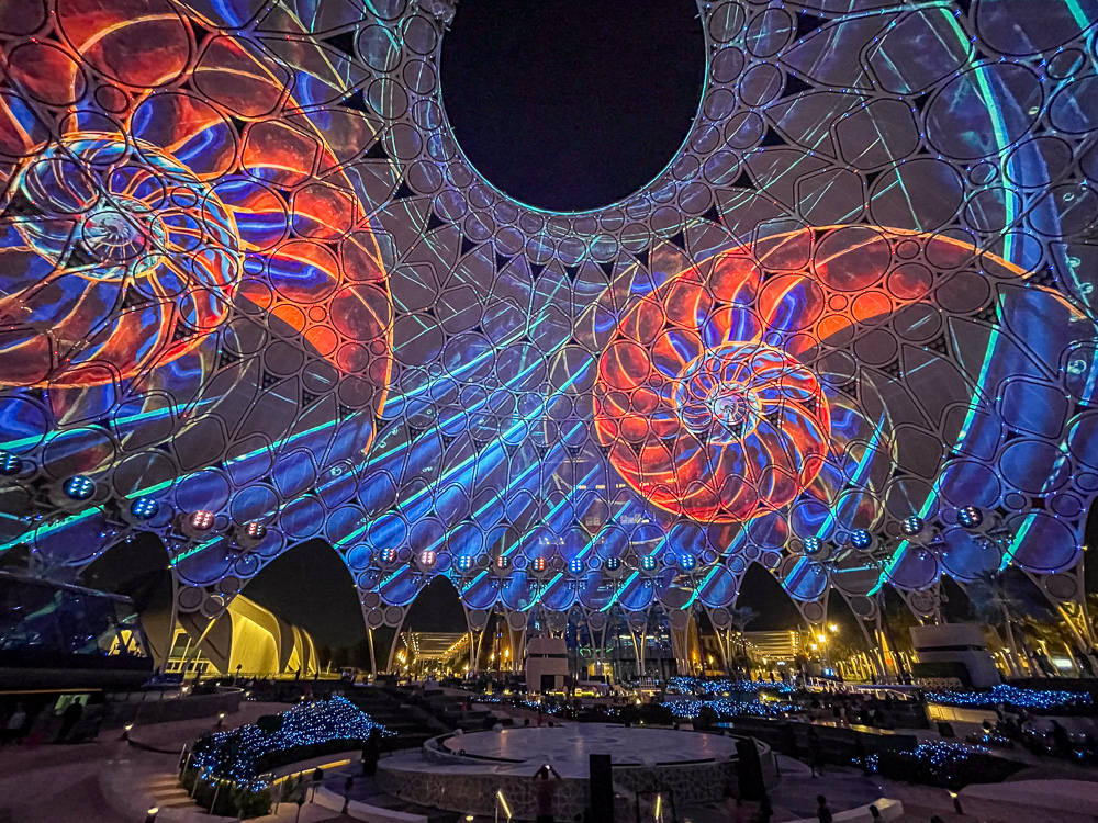 Danach geht’s gleich wieder zurück zum Al Wasl, der in der einsetzenden Dämmerung schon eindrucksvoll beleuchtet wird.