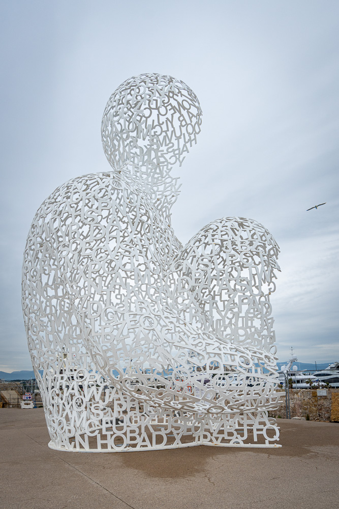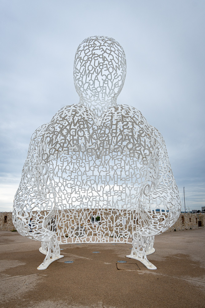 Und weil es gerade so schön ist, laufe ich weiter bis zum anderen Ende, wo der Hafen auf mich wartet. Zur Zeit ist dort viel Baustelle, doch das wird mich nicht aufhalten. Der acht Meter hohe, aus einer Aluminium-Buchstabenhülle bestehende Nomade des spanischen Künstlers Jaume Plensa beeindruckte mich schon aus der Ferne und weckte meine Neugier. Und so bahne ich mir meinen Weg durch die Baustellen und teils abgesperrten Bereiche, bis ich schließlich vor ihm stehe. Ist er nicht klasse?