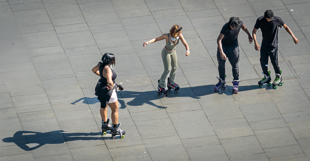 … von wo aus es nur noch ein kurzes Stück bis zum Centenary Square zu laufen ist. Der unbestrittene architektonische Platzhirsch ist hier die Library of Birmingham, die seit 2013 wie ein riesiger Stapel hübsch verpackter Weihnachtsgeschenke den Platz ziert. Die bislang größte öffentliche Bibliothek Europas ist eine Augenweide, die von den oberen Stockwerken aus auch grandiose Ausblicke über die Stadt gewährt. Und auf dem großzügigen Platz davor ziehen sportliche Rollerskater unermüdlich ihre Kreise.