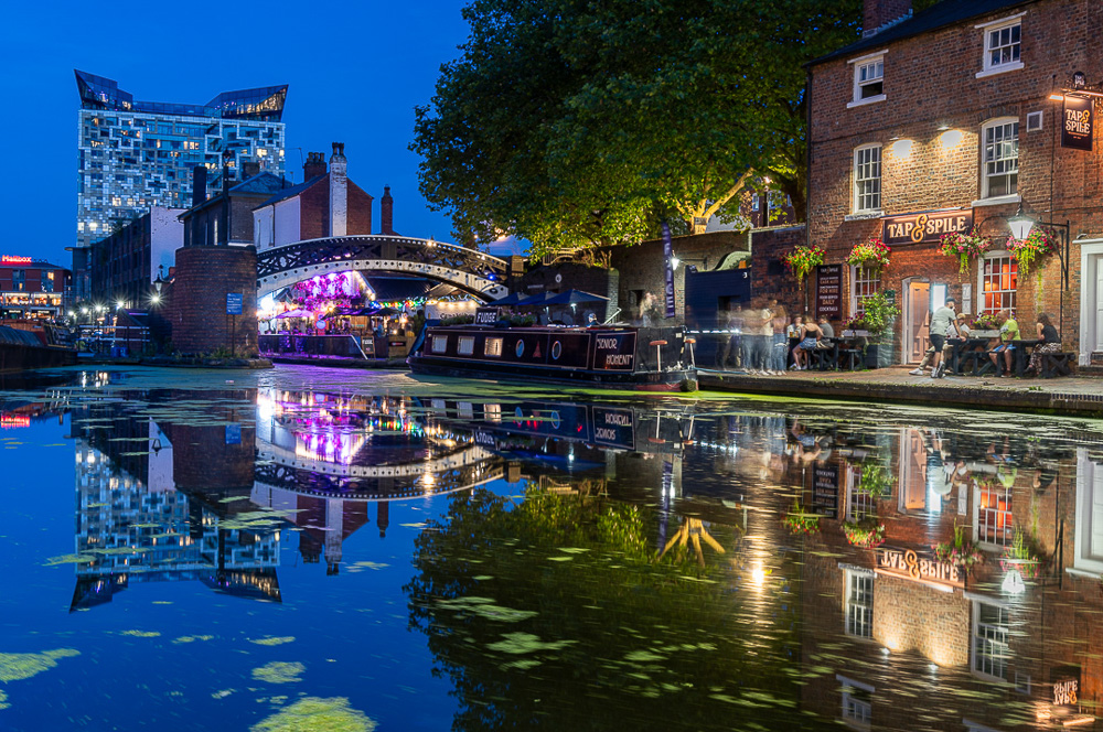 Nach einer Siesta im Hotel ziehen wir gegen Abend wieder los. Ging es tagsüber an den Kanälen rund um das Gas Bassin und den Brindley Place ruhig und beschaulich zu, so erleben wir nun das Kontrastprogramm. Die Party ist in vollem Gange an diesem Freitagabend! Wir genießen die Lebensfreude, das tolle Licht und die schöne Stimmung am Kanal, wo sich gefühlt die halbe Stadt tummelt. Dass Birmingham eine recht junge Bevölkerungsstruktur aufweist, glauben wir spätestens jetzt.