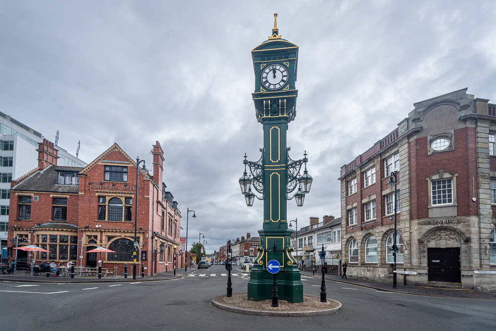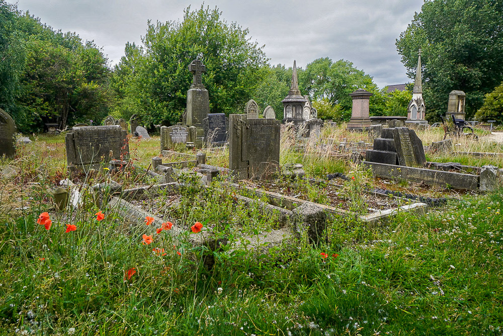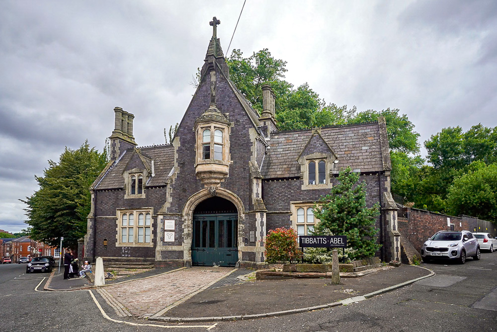 Kaum haben wir die Kreuzung mit dem markanten Uhrturm passiert, fällt uns noch eine Attraktion der etwas anderen Art ins Auge. Das Eingangsgebäude eines alten Friedhofs an der Warstone Lane …