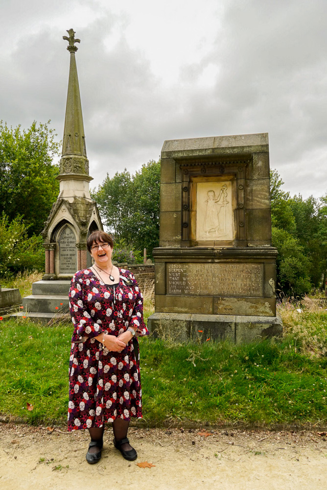 Doch! Und passend dazu trägt ein sehr nettes und gesprächiges Mitglied des hiesigen Hilfsvereins Friends of Key Hill & Warstone Lane Cemeteries auch ein einschlägig gemustertes Kleid. Hach, nicht zuletzt deshalb liebe ich England und vor allem die Engländer 😅.