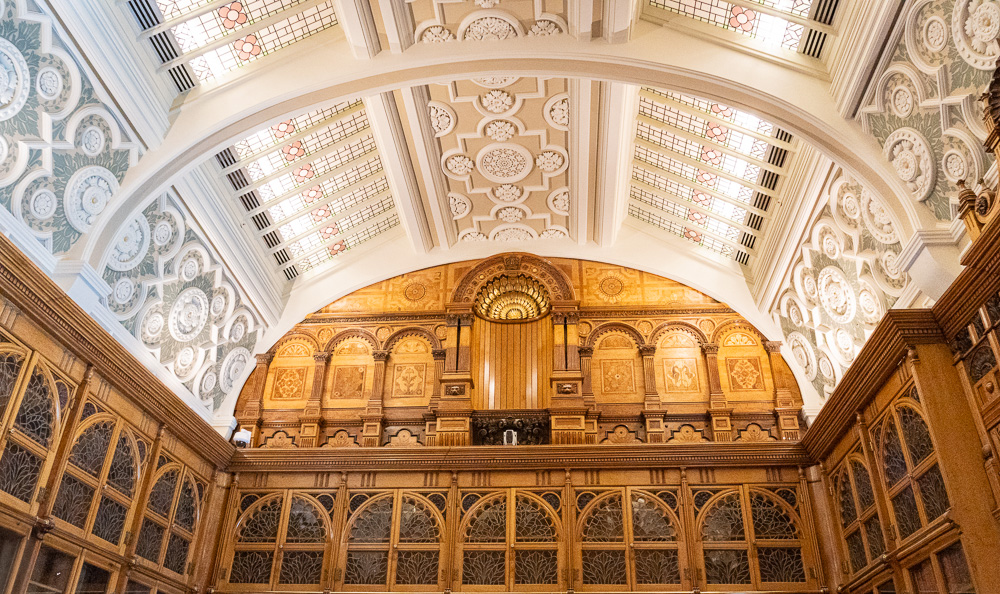 In der neunten Etage erwartet uns der Shakespeare Memorial Room, der sich ganz oben in der goldenen „Hutschachtel“ des Gebäudes befindet. Hier findet ihr die wohl bedeutendste Sammlung von Shakespeare-Werken weltweit. Und auch der Raum selbst kann sich sehen lassen. Falls ihr euch wundert, wieso der Baustil nicht zum Rest des Gebäudes passt: als die alte Bibliothek abgerissen wurde, wurde der Saal zerlegt und in das neue Gebäude integriert.