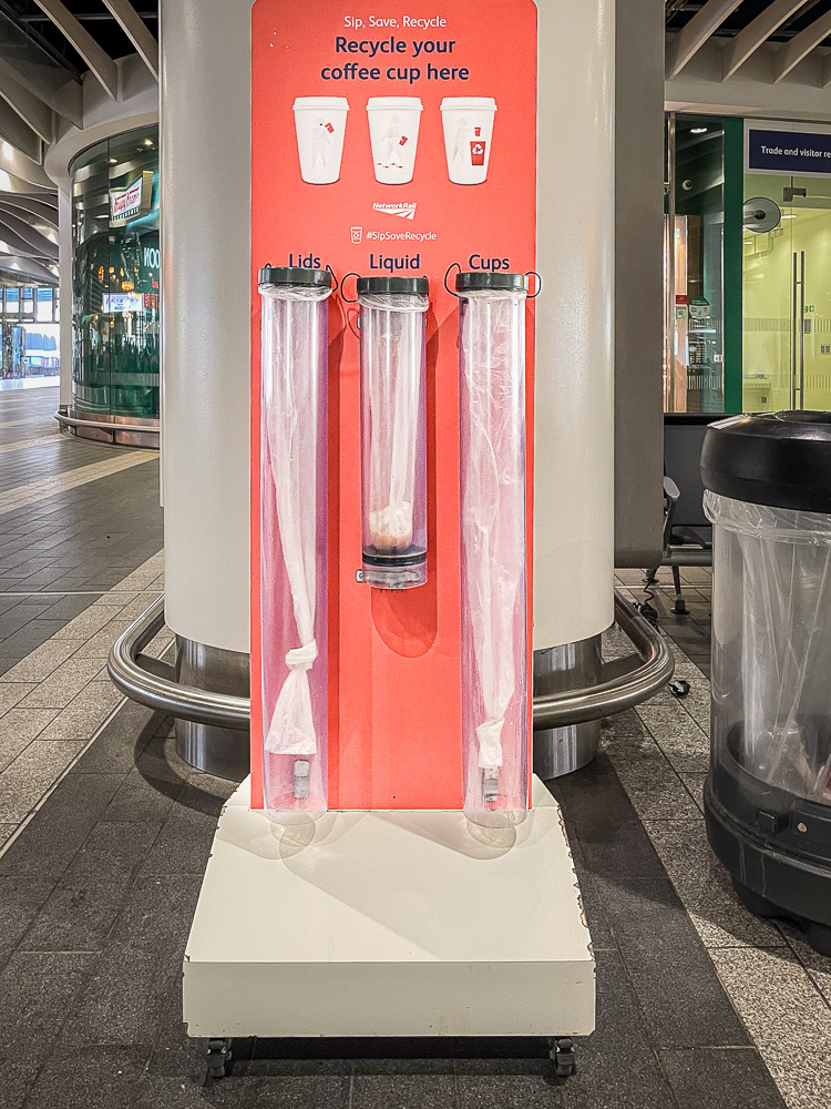 Unser Weg führt uns auch heute durch den Bahnhof New Street, wo uns eine etwas ausgefeiltere Variante des Recyclings von Bechern ins Auge fällt.