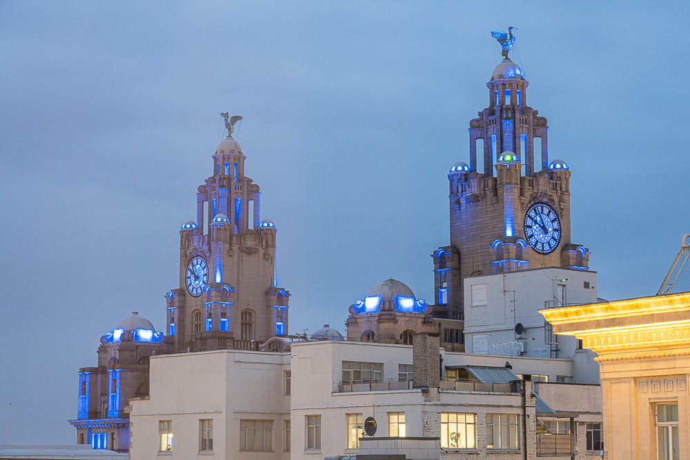 Mit einem Blick aus unserem Hotelfenster auf das Royal Liver Building in der Abenddämmerung verabschieden wir uns für heute von euch. Bis morgen!