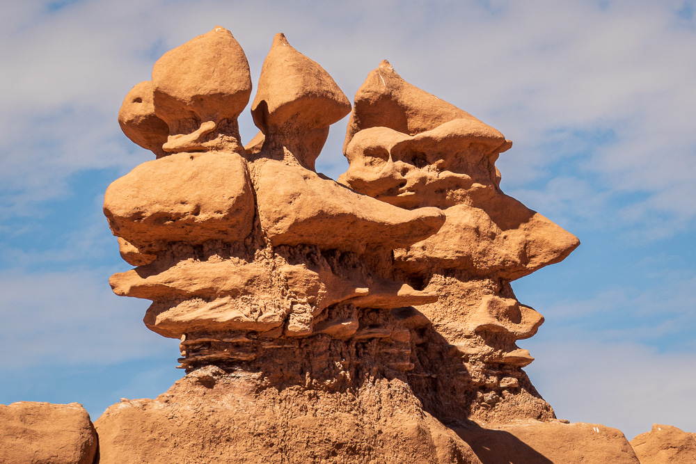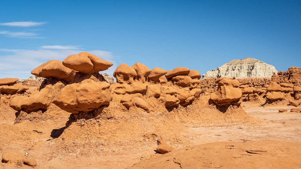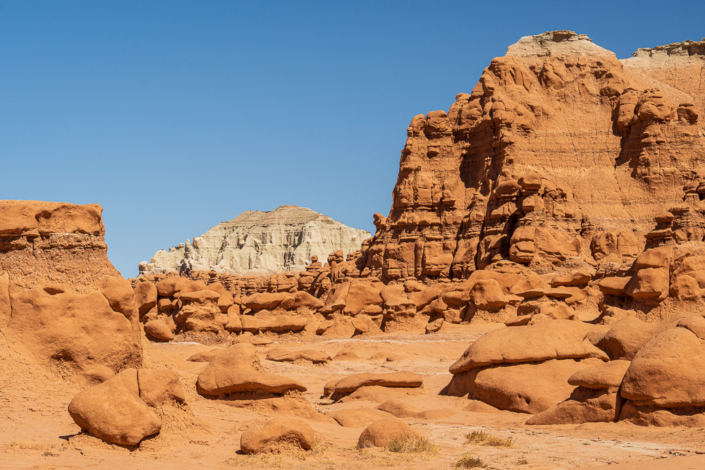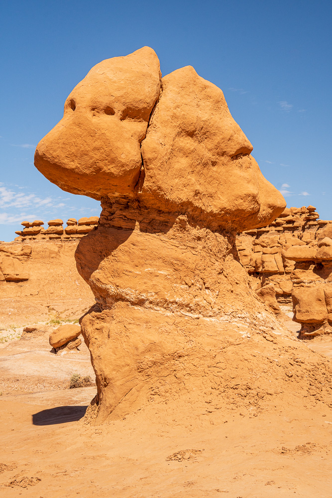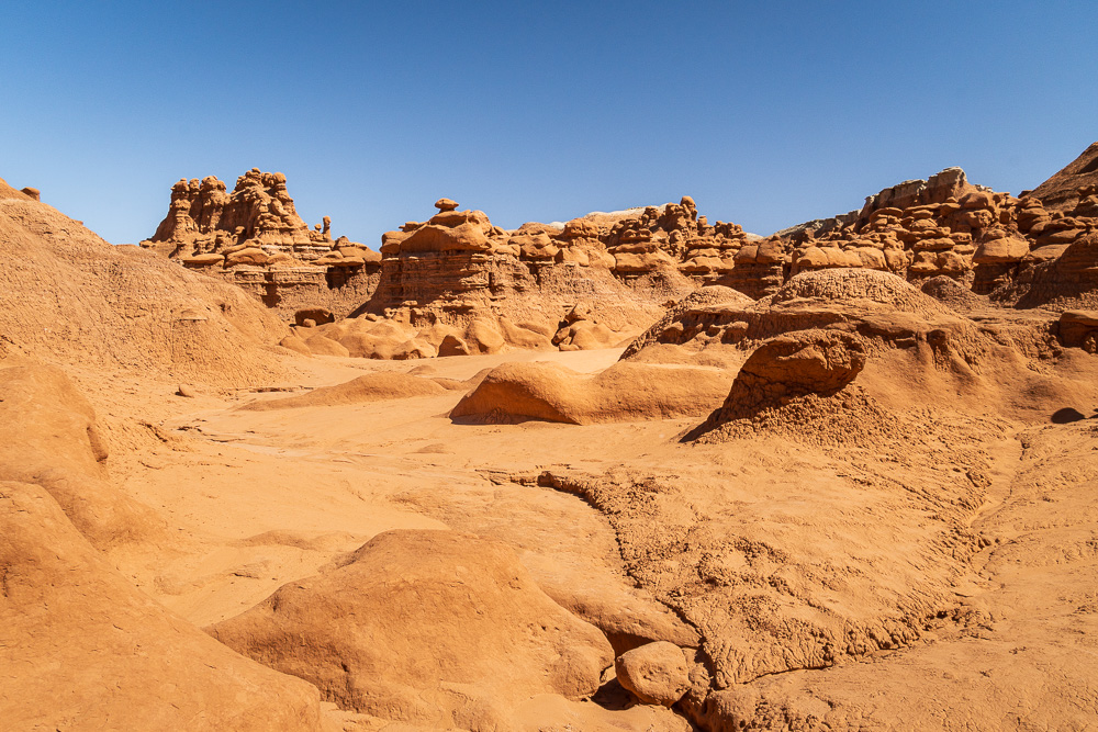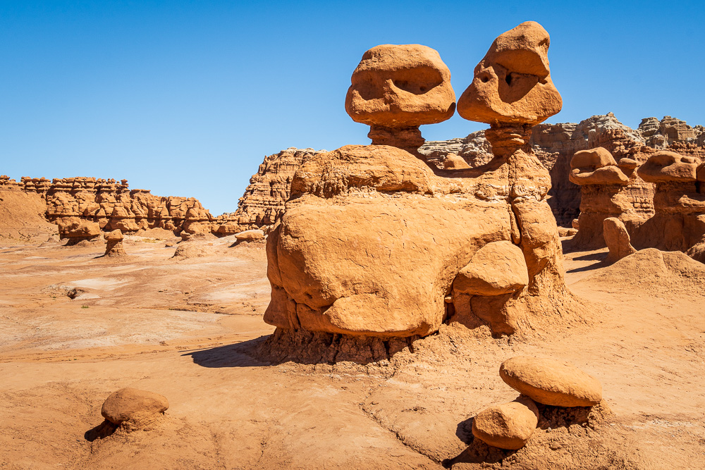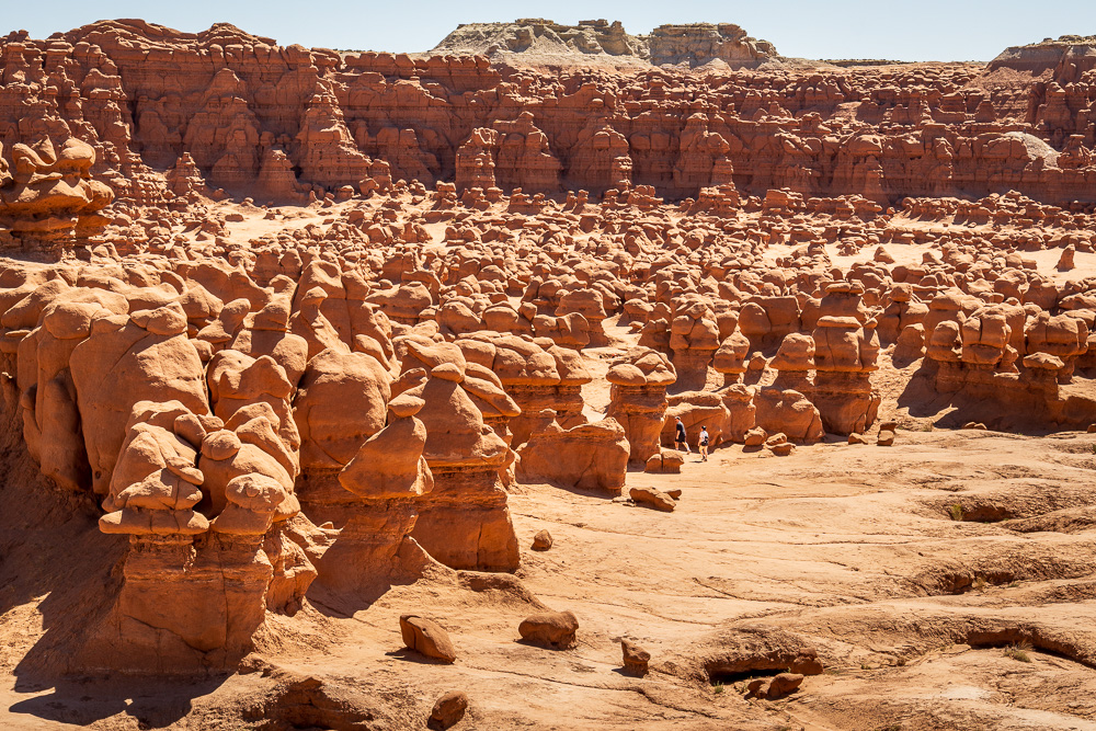 Insgesamt ergeben die drei durch das Goblin Valley führenden Wege eine Strecke von fast acht Kilometern. Doch die allgegenwärtige Hitze ist nur ein untergeordneter Grund dafür, dass wir nur einen Teil dieses fantastischen Areals anschauen. Vielmehr ist es so, dass wir uns staunend mal hier, mal da verlieren und kaum vom Fleck kommen. Und letztendlich mahnt auch irgendwann der Blick auf die Uhr.