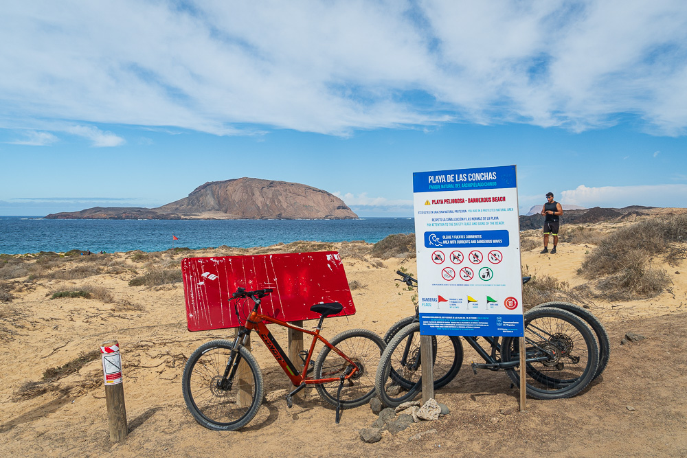 Ich bin an diesem Morgen früh genug am Start, um meine Pole Position gegenüber den noch nicht eingetroffenen Tagesgästen auszubauen. Nur eine Handvoll Jeeps und Radfahrer hoppeln an mir vorbei. Aber auch später wird es nicht wirklich voll. Es gibt nun mal Strände, die deutlich schneller und einfacher zu erreichen sind als die Playa de las Conchas, an der man im übrigen wegen der gefährlichen Strömung und Brandung auch nicht ins Wasser kann.