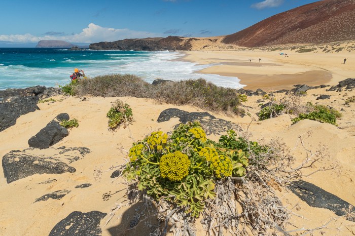 Dann ziehe ich weiter. Nur kurz wollte ich an der Playa de las Conchas weilen und mich etwas umsehen. Doch daraus werden fast zwei Stunden, denn der Strand ist einmalig. Was ich gelesen hatte, war keineswegs übertrieben: es ist einer der schönsten Strände überhaupt. Leicht abschüssig, ausladende Dünen drumherum, eine dekorative, rötlich gefärbte Bergkuppe dahinter, ein unbewohntes Inselchen davor. Das Ganze garniert mit schroffen, schwarzen Felsen und einer Brandung, die sich gewaschen hat.
