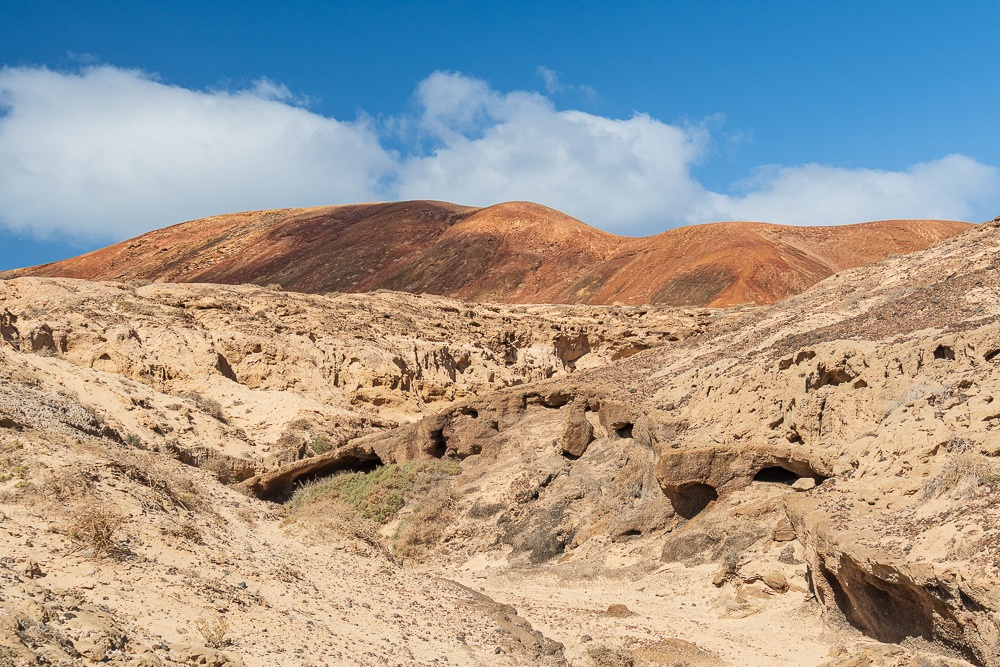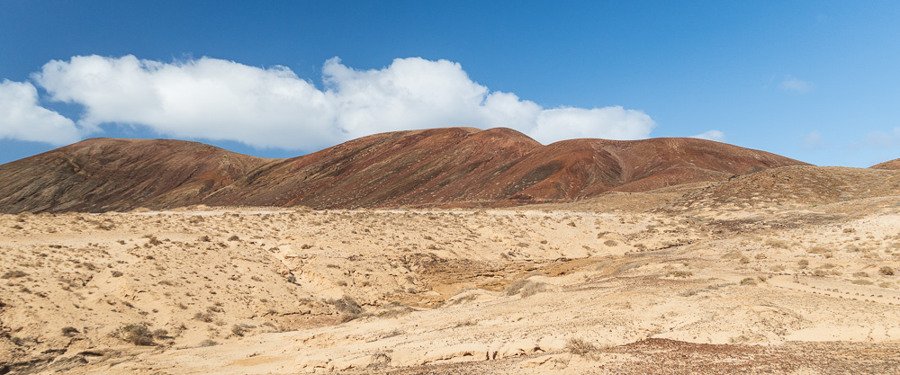 … einmal quer über die Insel. Mein Ziel ist die Playa de las Conchas. Ich hatte im Vorfeld mit dem Gedanken gespielt, ein Fahrrad zu mieten. Doch beim Anblick der sandigen, gerölligen, mit tiefen Schlaglöchern gespickten Schotterpisten habe ich darauf verzichtet. Ich verlasse mich lieber auf meine eingebauten Fortbewegungsmittel. Der Hin- und Rückweg beträgt je sechs Kilometer. Die kann ich auch locker laufen. Eine gute Entscheidung!