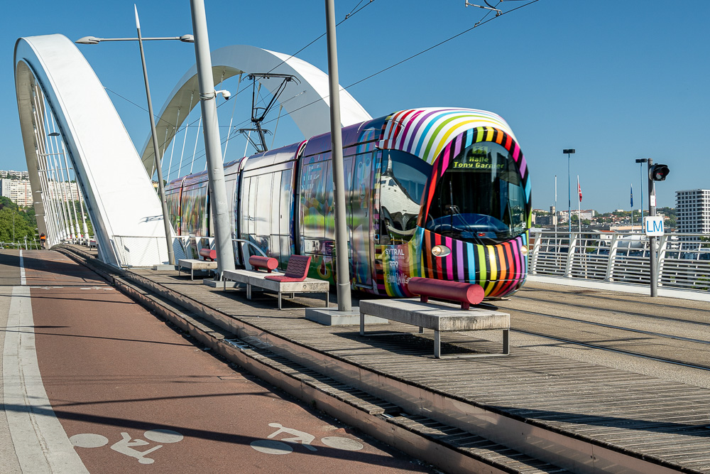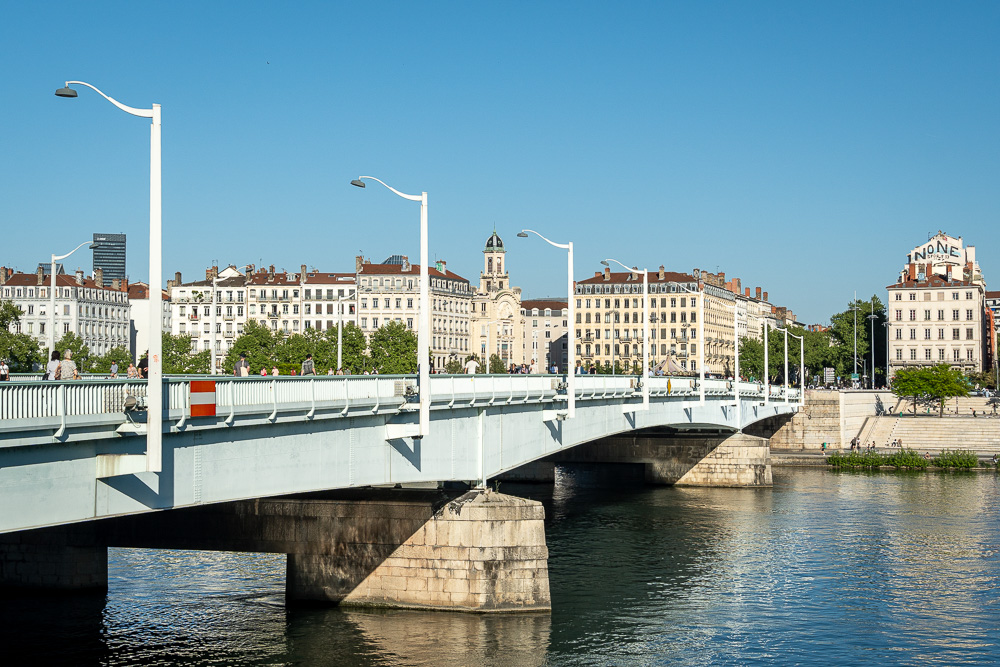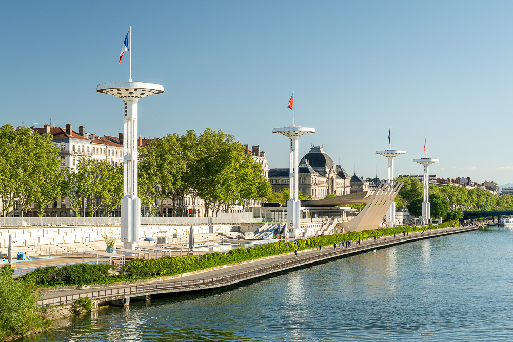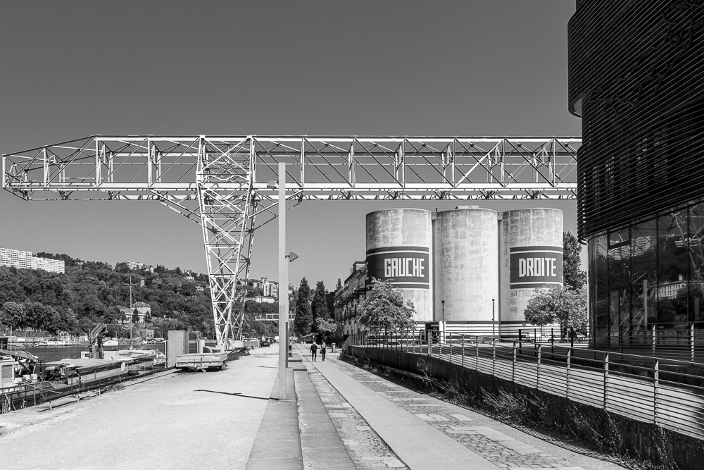 Nachdem ich mich dort ausgiebig ausgetobt habe, flaniere ich am Ufer der Saône gen Norden und schaue, was dort schon alles realisiert wurde bei der Umgestaltung des ehemaligen Industrieareals. Der Uferweg ist richtig schön! Hier wurde und wird kräftig umgebaut und umgenutzt, doch immer mit behutsamem Blick darauf, dass das baulich Charakteristische der ehemaligen Nutzung immer noch durchblitzt. Hier und da scheint noch ein wenig an alltäglicher Infrastruktur zu fehlen. Doch das Ganze ist ja noch im Werden. Gastronomie gibt es jedenfalls genug, und der Bahnhof Perrache mit seinem gut ausgestatteten Umfeld ist ja nicht weit.