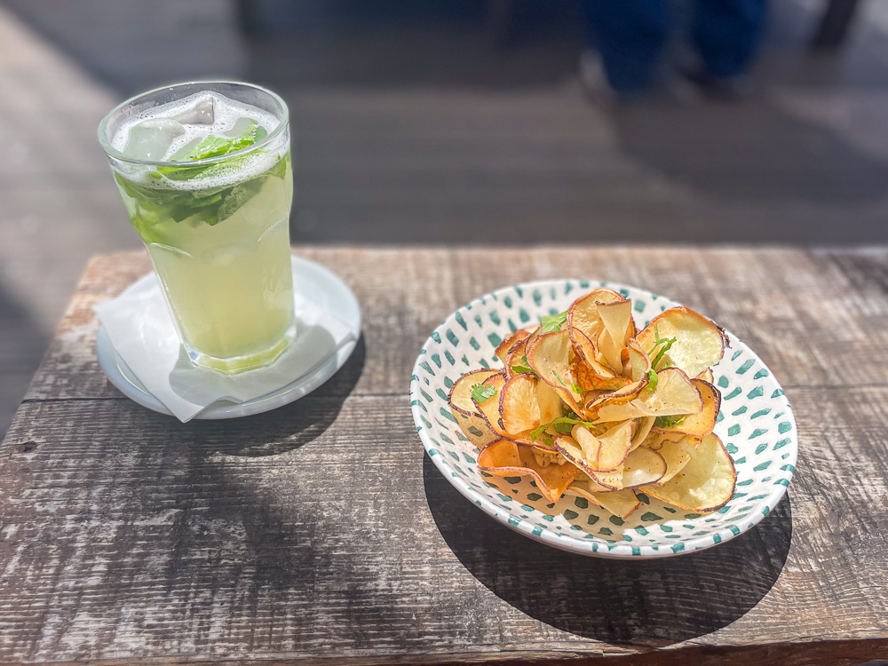 … und setze mich dann gen Süden in Bewegung. Direkt an der Küste führt eine richtig schöne Promenade entlang, die zwischendurch immer mal wieder als normaler Bürgersteig neben der zum Glück recht wenig befahrenen Straße daherkommt. So schlendere ich gemütlich des Weges und bleibe immer wieder kurz stehen, um die Aussicht zu genießen. Und zwischendurch kehre ich in der Strandbar Praia Luz für ein kühles Getränk und einen interessanten Snack ein. Die Kombination von Maniok-Chips mit Hummus und frischem Koriander schmeckt richtig gut!