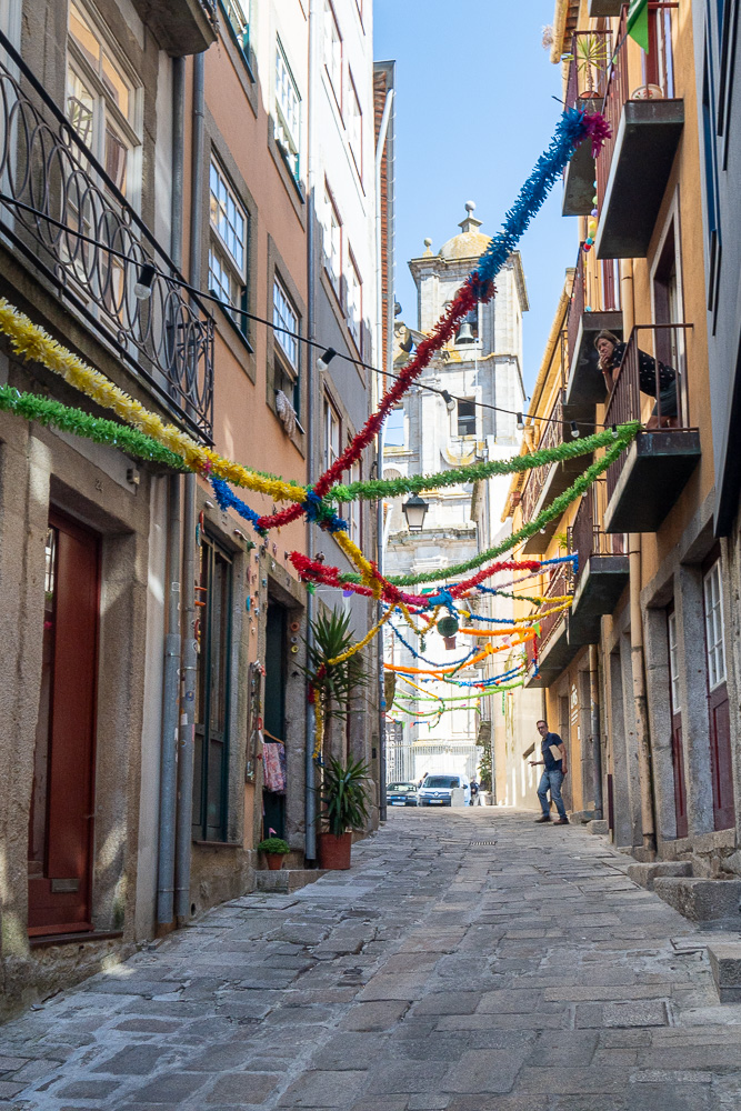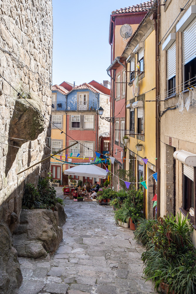 Nun bin ich reif für eine schöpferische Pause. Rein in den nächsten Bus, raus am bereits bestens bekannten Ufer in Ribeira, dem Altstadtviertel zu Füßen der Ponte Dom Luís I. Da ich hier bereits ausgiebig fotografiert hatte, beschränke ich mich auf ein paar Detailaufnahmen, die dank der engen, verschachtelten und kunterbunten Bebauung fast wie eine Fotomontage aussehen.