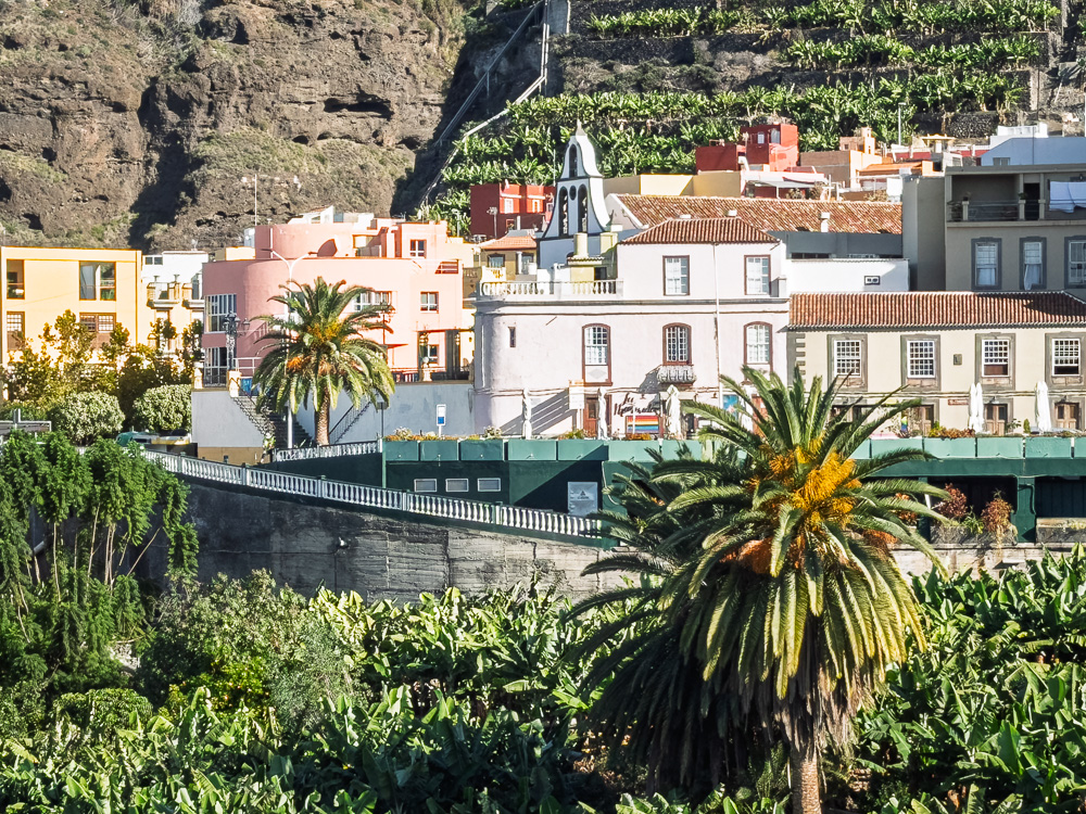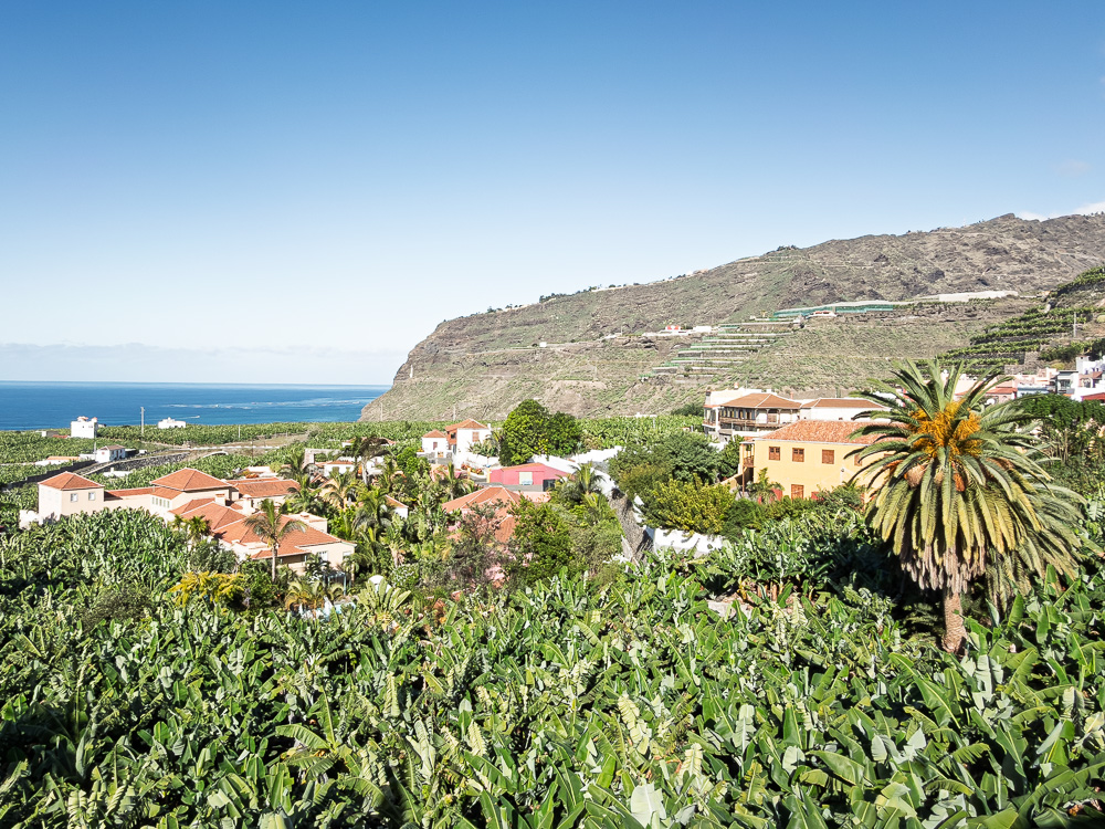 Der Bus mit der Nummer 110 bringt mich binnen 20 Minuten nach Tazacorte. Der kurze Weg dorthin führt durch kleine Orte, bietet hier und da Ausblicke auf die Berge und führt fast durchgehend vorbei an endlosen Plantagen voller gelber Früchte. Völlig Banane!