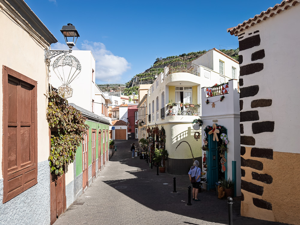 Downtown Tazacorte steige ich aus. Ich lasse mich durch den Ort und entlang der weihnachtlich geschmückten Promenade treiben. Das terrassenförmig angelegte Städtchen packt mich sofort. Bunte, gepflegte Häuser, strahlende Sonne, das Leben findet draußen statt. ¿Un cafecito? ¡Claro que si! Überall Blütenduft und Farbenpracht. Ach, das Leben ist schön!