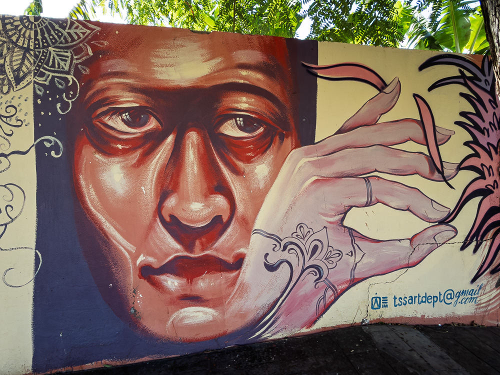 Nun zieht es mich ans Wasser. An der wenig befahrenen Straße entlang laufe ich die etwas mehr als zwei Kilometer zu Fuß hinunter zum Meer. Zwischendrin nehme ich eine kleine Abkürzung, die mir den (wenn auch moderaten) Autoverkehr erspart. Stattdessen gibt es Spirituelles auf dem Weg.